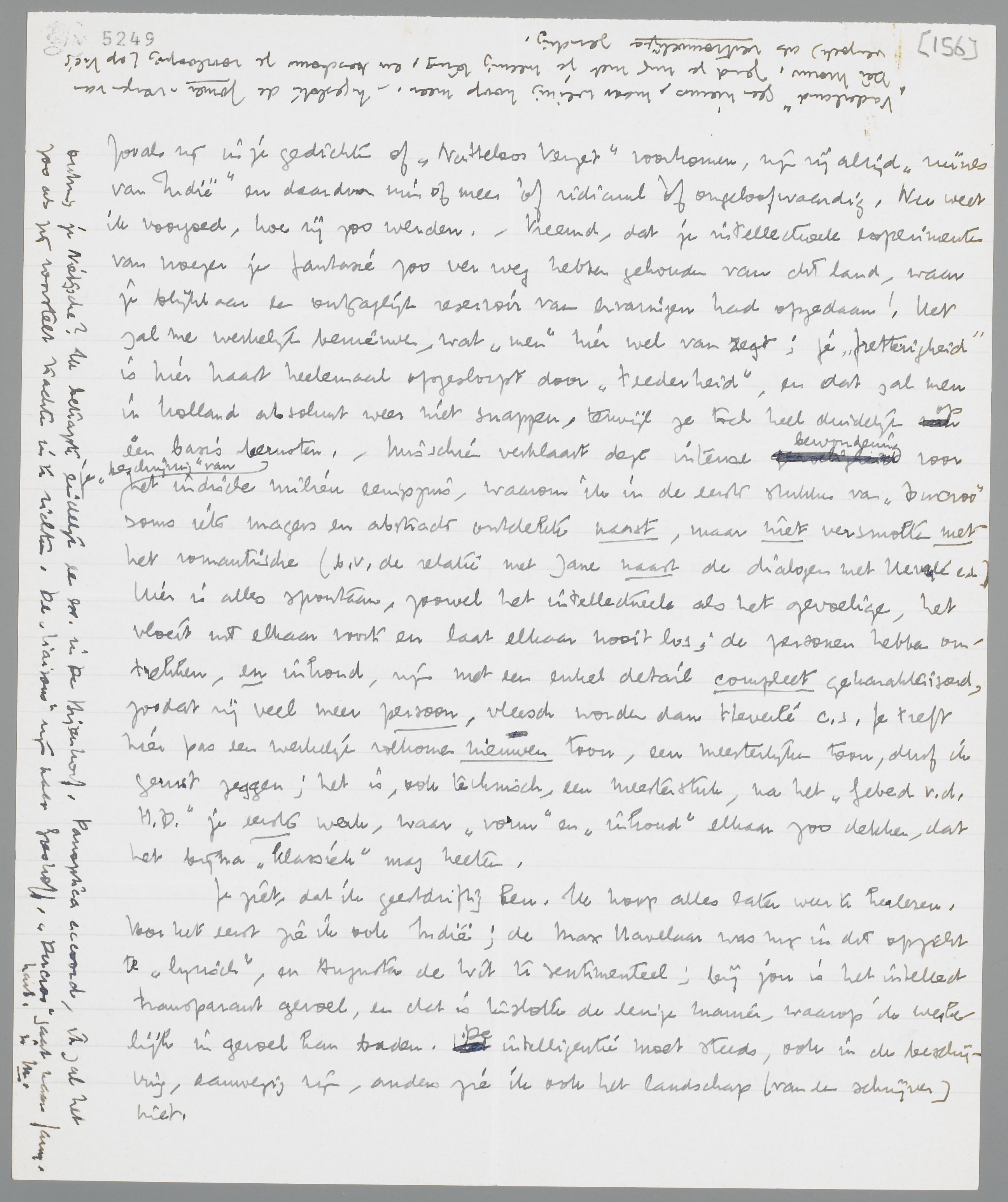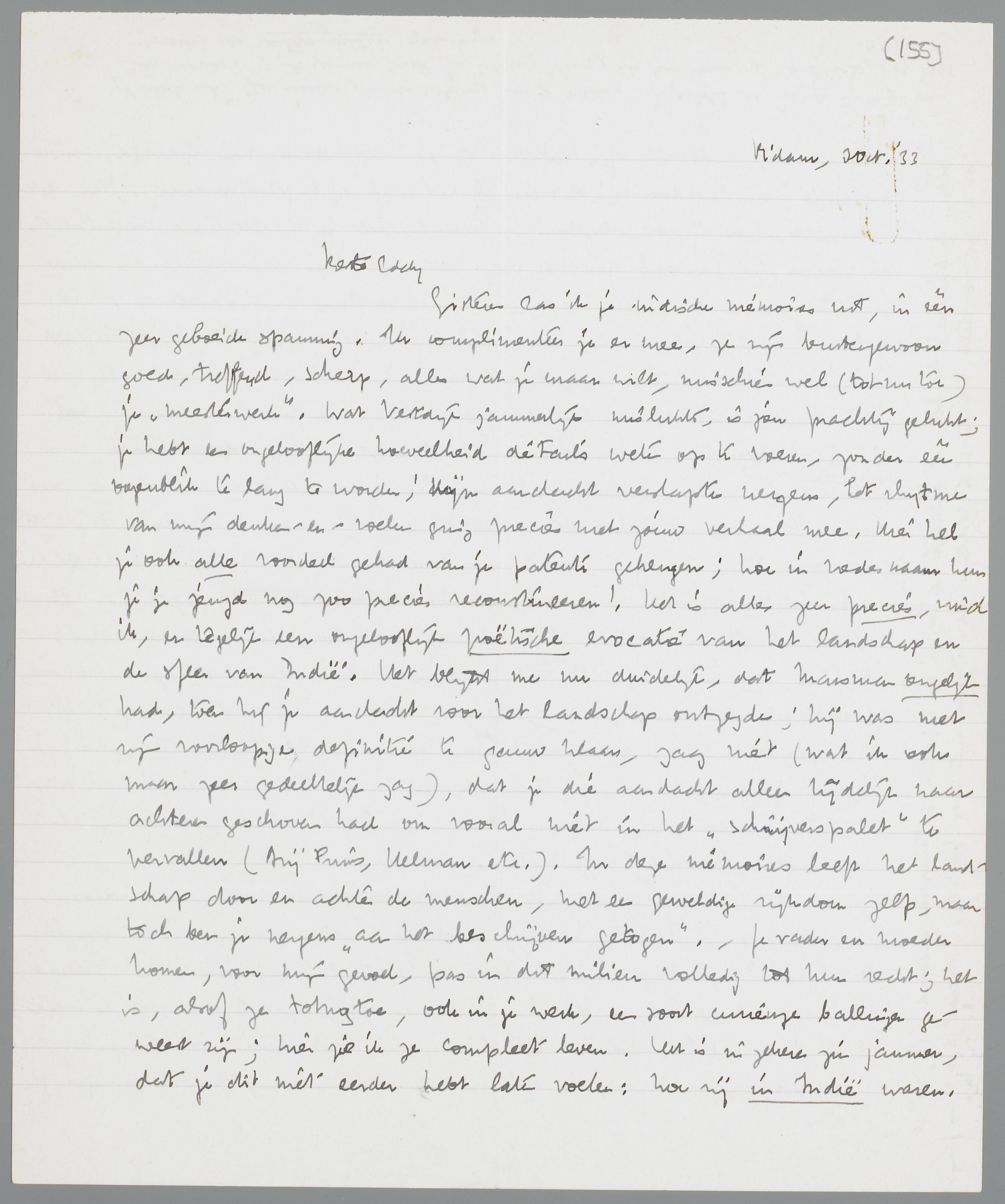 Je ziet, dat ik geestdriftig ben. Ik hoop alles later weer te herlezen. Voor het eerst zie ik ook Indië; de Max Havelaar was mij in dit opzicht te ‘lyrisch’, en Augusta de Wit te sentimenteel; bij jou is het intellect transparant gevoel, en dat is tenslotte de eenige manier, waarop ik werkelijk in gevoel kan baden. De intelligentie moet steeds, ook in de beschrijving, aanwezig zijn, anders zie ik ook het landschap (van een schrijver) niet.