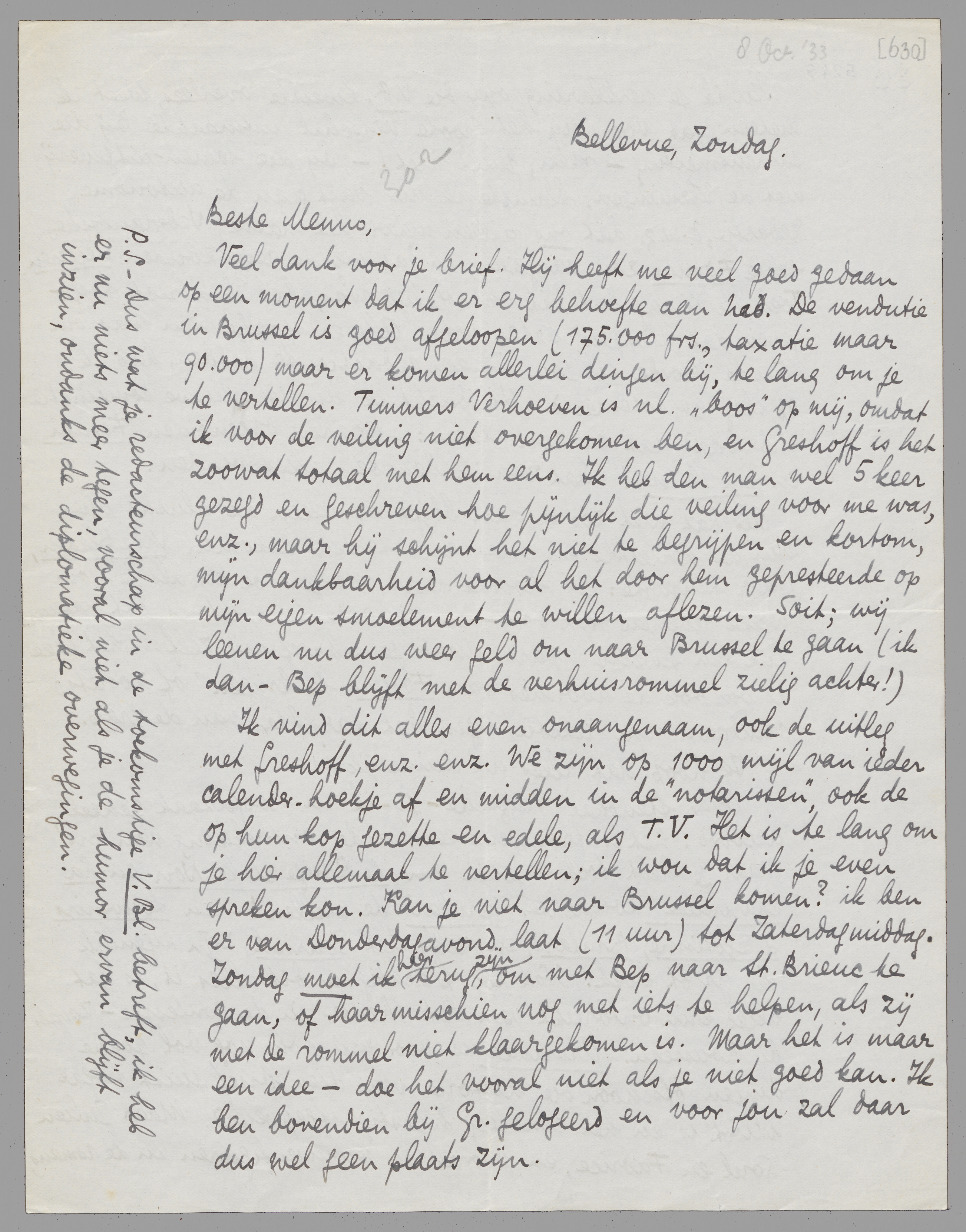 Veel dank voor je brief. Hij heeft me veel goed gedaan op een moment dat ik er erg behoefte aan had. De vendutie in Brussel is goed afgeloopen (175.000 frs., taxatie maar 90.000) maar er komen allerlei dingen bij, te lang om je te vertellen. Timmers Verhoeven is nl. ‘boos’ op mij, omdat ik voor de veiling niet overgekomen ben, en Greshoff is het zoowat totaal met hem eens. Ik heb den man wel 5 keer gezegd en geschreven hoe pijnlijk die veiling voor me was, enz., maar hij schijnt het niet te begrijpen en kortom, mijn dankbaarheid voor al het door hem gepresteerde op mijn eigen smoelement te willen aflezen. Soit; wij leenen nu dus weer geld om naar Brussel te gaan (ik dan - Bep blijft met de verhuisrommel zielig achter!)