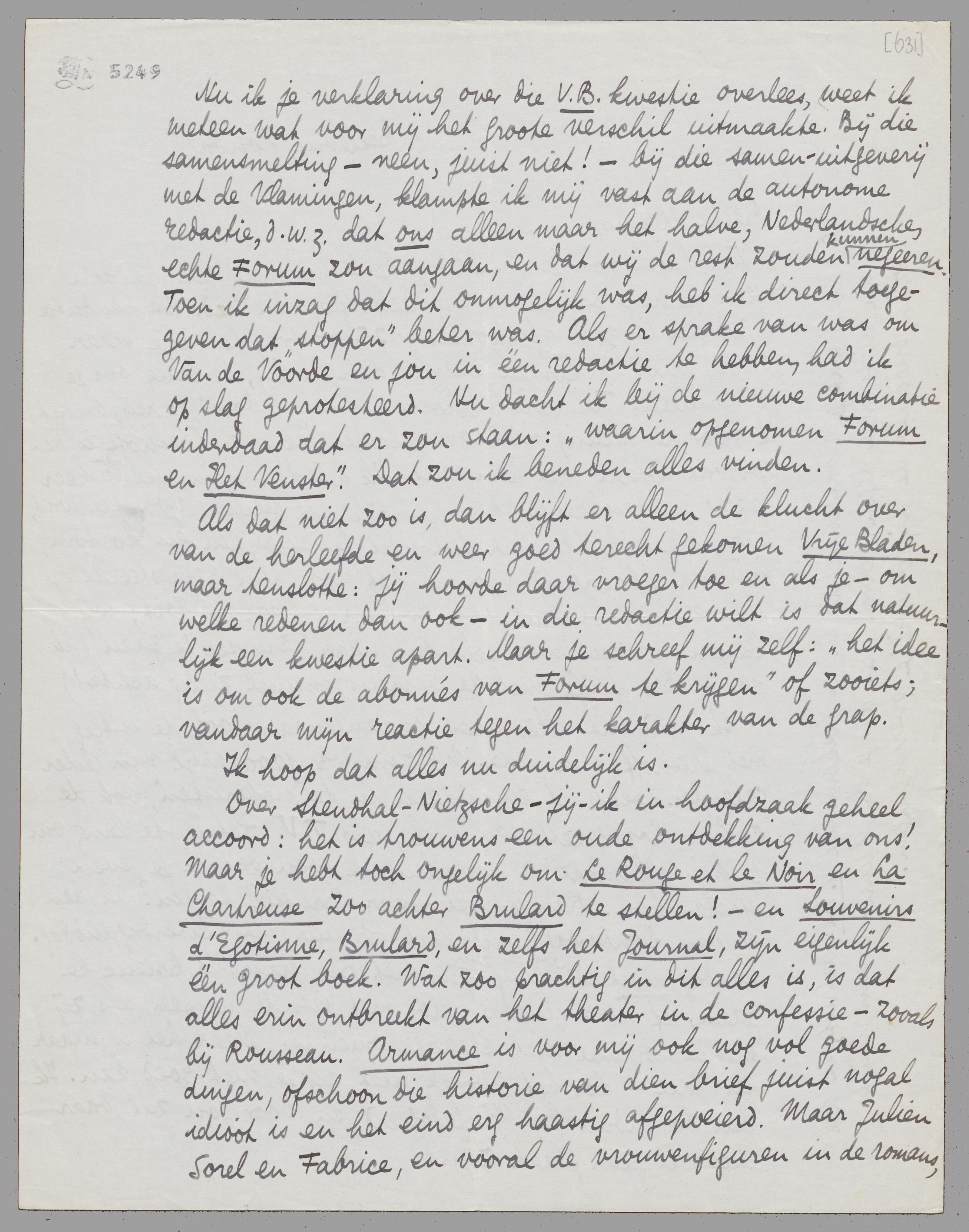 Ik vind dit alles even onaangenaam, ook de uitleg met Greshoff, enz. enz. We zijn op 1000 mijl van ieder calenderhoekje af en midden in de ‘notarissen’, ook de op hun kop gezette en edele, als T.V. Het is te lang om je hier allemaal te vertellen; ik wou dat ik je even spreken kon. Kan je niet naar Brussel komen? ik ben er van Donderdagavond laat (11 uur) tot Zaterdagmiddag. Zondag moet ik hier terug zijn, om met Bep naar St. Brieuc te gaan, of haar misschien nog met iets te helpen, als zij met de rommel niet klaargekomen is. Maar het is maar een idee - doe het vooral niet als je niet goed kan. Ik ben bovendien bij Gr. gelogeerd en voor jou zal daar dus wel geen plaats zijn. Nu ik je verklaring over die V.B. kwestie overlees, weet ik meteen wat voor mij het groote verschil uitmaakte. Bij die samensmelting-neen, juist niet! - bij die samenuitgeverij met de Vlamingen, klampte ik mij vast aan de autonome redactie, d.w.z. dat ons alleen maar het halve, Nederlandsche, echte Forum zou aangaan, en dat wij de rest zouden kunnen negeeren. Toen ik inzag dat dit onmogelijk was, heb ik direct toegegeven dat ‘stoppen’ beter was. Als er sprake van was om Van de Voorde en jou in één redactie te hebben, had ik op slag geprotesteerd. Nu dacht ik bij de nieuwe combinatie inderdaad dat er zou staan: ‘waarin opgenomen Forum en Het Venster’. Dat zou ik beneden alles vinden.