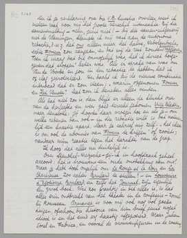 Schrijf géén veroordeeling van Dumay. Je doet het tegenover de runderen (de Donkers, Theun de Vriezen, zelfs de Helmans) voor wie Dumay nog 10 × te goed is. Ik schreef Thelen laatst dat ik voor Dumay nog altijd een handvol Stille Plantages cadeau gaf; dààrop was o.a. zijn antwoord over mijn ‘eerlijkheid’. Hij zelf vond De Stille Plantage nl. prachtig (wat te denken geeft voor een zoo picareske geest) en Helman's talent ‘verdammt grosz’. Ik schreef hem dat ik het vooral toch ‘verdammt vervelend’ begon te vinden [steeds méér na Zuid-Zuid-West.] - maar ik wacht nu op Waarom niet, vooral sinds de aankondiging op het omslag van Forum! [Het mooie is dat je op die annonce lezen kunt: ‘Waarom niet door Albert Helman’. Waarom ook niet, inderdaad; het zou de eerste universeele geest van dit gehalte niet zijn!] Zorg jij ervoor dat ik dit boek vooral krijg? Bedel het Zijlstra af, koop het vooral niet. Maar zend het mij naar Bretagne, opdat ik de geschiedenis der menschheid en de internationale wereld die Helman zoo door-en-door kent toch kennen leere!