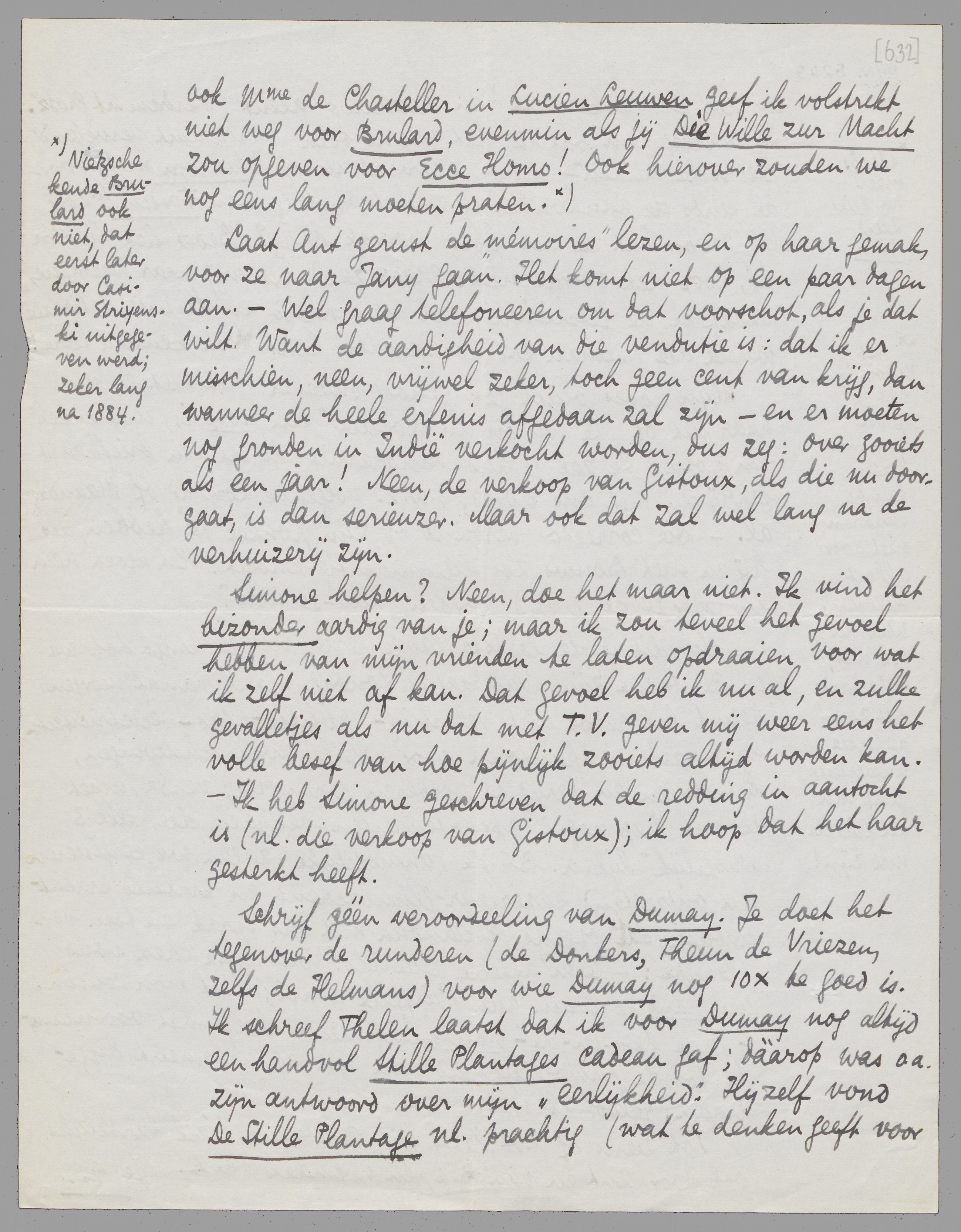 Over Stendhal-Nietzsche-jij-ik in hoofdzaak geheel accoord: het is trouwens een oude ontdekking van ons! Maar je hebt toch ongelijk om Le Rouge et le Noir en La Chartreuse zoo achter Brulard te stellen! - en Souvenirs d'Egotisme, Brulard, en zelfs het Journal, zijn eigenlijk één groot boek. Wat zoo prachtig in dit alles is, is dat alles erin ontbreekt van het theater in de confessie - zooals bij Rousseau. Armance is voor mij ook nog vol goede dingen, ofschoon die historie van dien brief juist nogal idioot is en het eind erg haastig afgepoeierd. Maar Julien Sorel en Fabrice, en vooral de vrouwenfiguren in de romans, ook Mme de Chasteller in Lucien Leuwen geef ik volstrekt niet weg voor Brulard, evenmin als jij Die Wille zur Macht zou opgeven voor Ecce Homo! Ook hierover zouden we nog eens lang moeten praten. Nietzsche kende Brulard ook niet, dat eerst later door Casimir Striyenski uitgegeven werd; zeker lang na 1884.