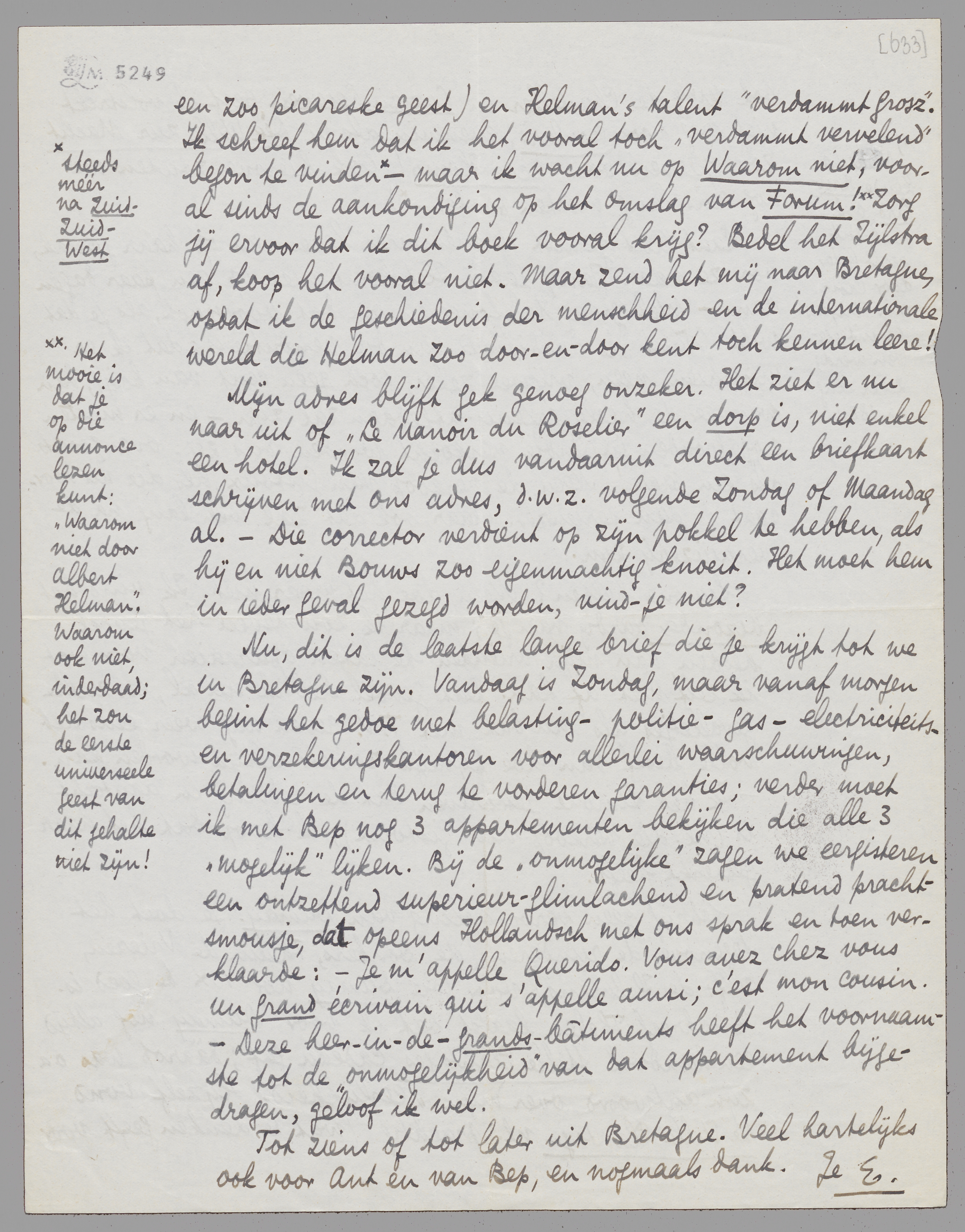 Nu, dit is de laatste lange brief die je krijgt tot we in Bretagne zijn. Vandaag is Zondag, maar vanaf morgen begint het gedoe met belasting-politie-gas-electriciteits- en verzekeringskantoren voor allerlei waarschuwingen, betalingen en terug te vorderen garanties; verder moet ik met Bep nog 3 appartementen bekijken die alle 3 ‘mogelijk’ lijken. Bij de ‘onmogelijke’ zagen we eergisteren een ontzettend superieur-glimlachend en pratend prachtsmousje, dat opeens Hollandsch met ons sprak en toen verklaarde: - Je m'appelle Querido. Vous avez chez vous un grand écrivain qui s'appelle ainsi; c'est mon cousin. - Deze heer-in-de-grands-bâtiments heeft het voornaamste tot de ‘onmogelijkheid’ van dat appartement bijgedragen, geloof ik wel. Tot ziens of tot later uit Bretagne. Veel hartelijks ook voor Ant en van Bep, en nogmaals dank.