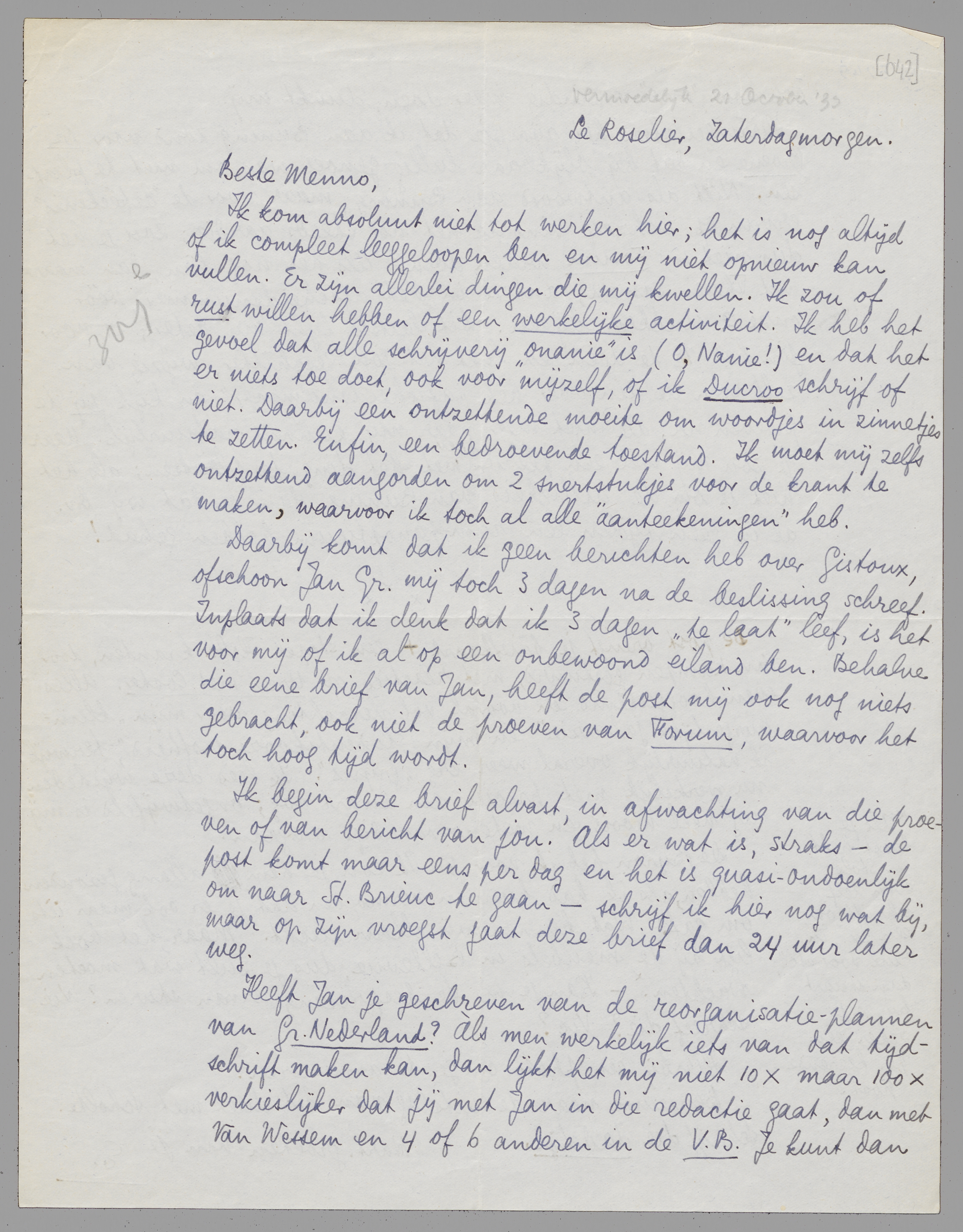 Daarbij komt dat ik geen berichten heb over Gistoux, ofschoon Jan Gr. mij toch 3 dagen na de beslissing schreef. Inplaats dat ik denk dat ik 3 dagen ‘te laat’ leef, is het voor mij of ik al op een onbewoond eiland ben. Behalve die eene brief van Jan, heeft de post mij ook nog niets gebracht, ook niet de proeven van Forum, waarvoor het toch hoog tijd wordt.