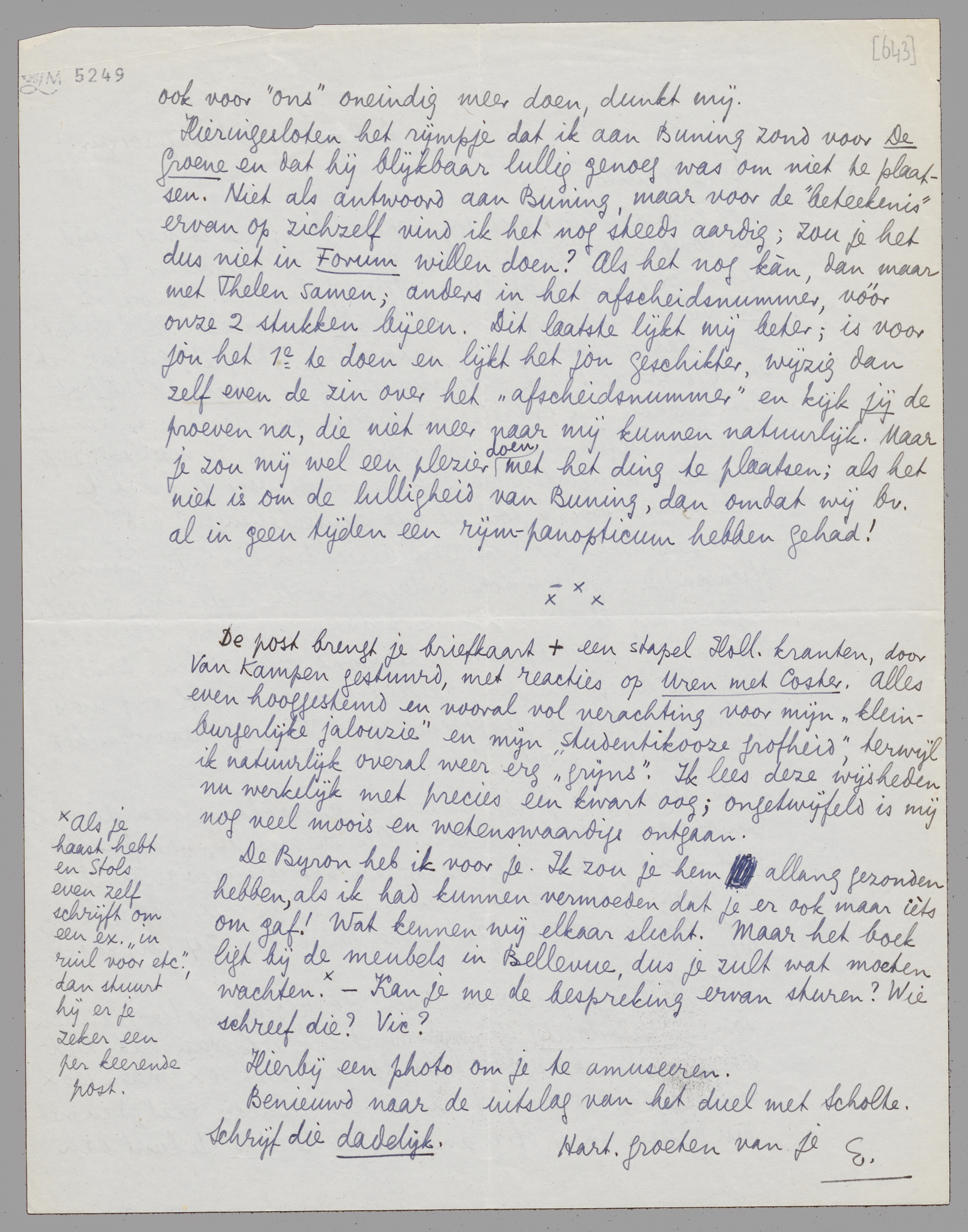 Hieringesloten het rijmpje dat ik aan Buning zond voor De Groene en dat hij blijkbaar lullig genoeg was om niet te plaatsen. Niet als antwoord aan Buning, maar voor de ‘beteekenis’ ervan op zichzelf vind ik het nog steeds aardig; zou je het dus niet in Forum willen doen? Als het nog kàn, dan maar met Thelen samen; anders in het afscheidsnummer, vóór onze 2 stukken bijeen. Dit laatste lijkt mij beter; is voor jou het 1e te doen en lijkt het jou geschikter, wijzig dan zelf even de zin over het ‘afscheidsnummer’ en kijk jij de proeven na, die niet meer naar mij kunnen natuurlijk. Maar je zou mij wel een plezier doen met het ding te plaatsen; als het niet is om de lulligheid van Buning, dan omdat wij bv. al in geen tijden een rijm-panopticum hebben gehad!