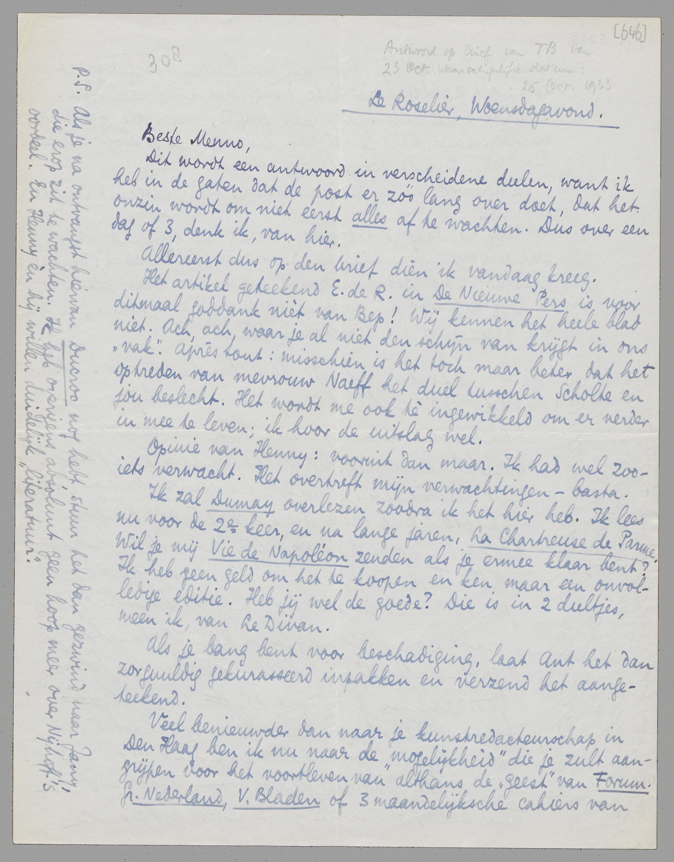 P.S. Als je na ontvangst hiervan Ducroo nog hebt, stuur het dan gezwind naar Jany, die erop zit te wachten. Ik heb overigens absoluut geen hoop meer over Nijhoff's oordeel. En Henny èn hij willen duidelijk ‘literatuur’.