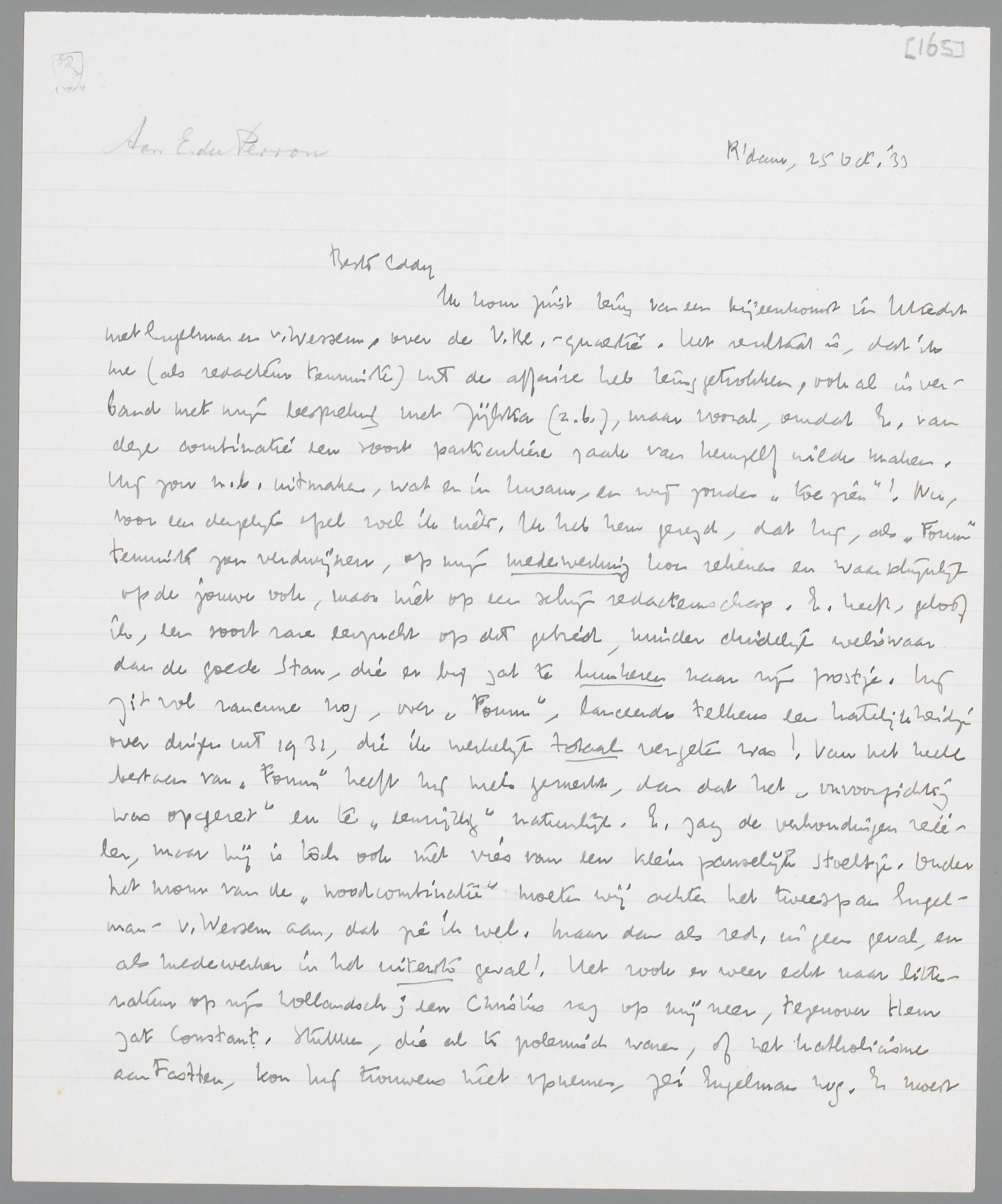 Ik kom juist terug van een bijeenkomst in Utrecht met Engelman en v. Wessem, over de V.Bl. - quaestie. Het resultaat is, dat ik me (als redacteur tenminste) uit de affaire heb teruggetrokken, ook al in verband met mijn bespreking met Zijlstra (z.b.), maar vooral, omdat E. van deze combinatie een soort particuliere zaak van hemzelf wilde maken. Hij zou n.b. uitmaken, wat er in kwam, en wij zouden ‘toe zien’! Nu, voor een dergelijk spel voel ik niets. Ik heb hem gezegd, dat hij, als Forum tenminste zou verdwijnen, op mijn medewerking kon rekenen en waarschijnlijk op het jouwe ook, maar niet op een schijn redacteurschap. E. heeft, geloof ik, een soort rare eerzucht op dit gebied, minder duidelijk weliswaar dan de goede Stan, die er bij zat te hunkeren naar zijn postje. Hij zit vol rancune nog, over Forum, lanceerde telkens een hatelijkheidje over dingen uit 1931, die ik werkelijk totaal vergeten was! Van het heele bestaan van Forum heeft hij niets gemerkt, dan dat het ‘onvoorzichtig was opgezet’ en te ‘eenzijdig’ natuurlijk. E. zag de verhoudingen reëeler, maar hij is toch ook niet vies van een klein pauselijk stoeltje. Onder het mom van de ‘noodcombinatie’ moeten wij achter het tweespan Engelman-v. Wessem aan, dat zie ik wel. Maar dan als red. in geen geval, en als medewerker in het uiterste geval! Het rook er weer echt naar litteratuur op zijn hollandsch; een Christus zag op mij neer, tegenover Hem zat Constant. Stukken, die al te polemisch waren, of het katholicisme aantastten, kon hij trouwens niet opnemen, zei Engelman nog. Er moest nu eindelijk eens een blad komen, dat door de boekhandelaren en de portefeuilles kon worden geaccepteerd.*