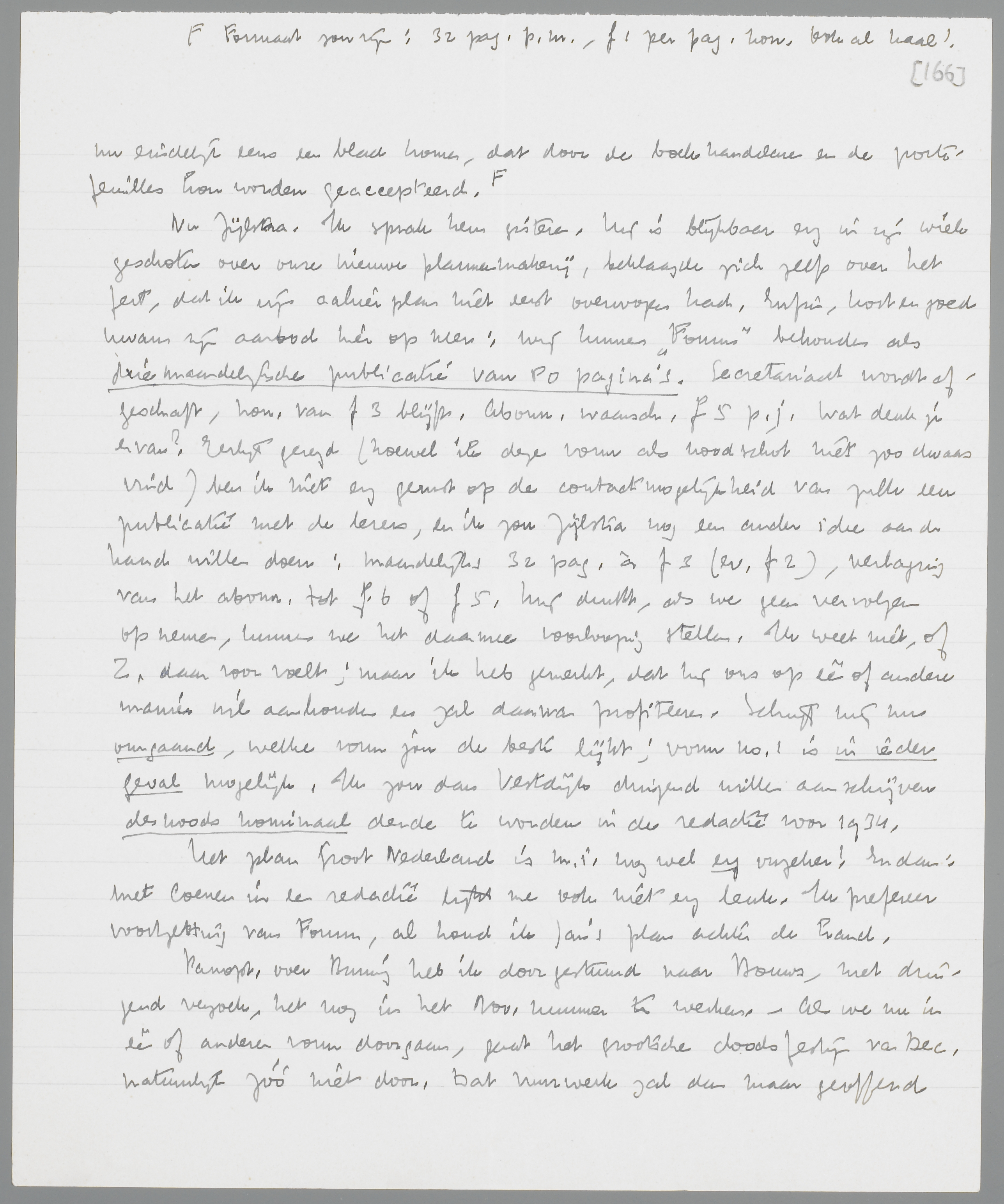 * Formaat zou zijn: 32 pag. p. nr., ƒ 1 per pag. hon. Ook al kaal!