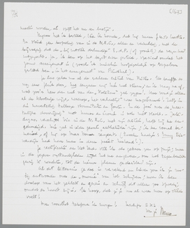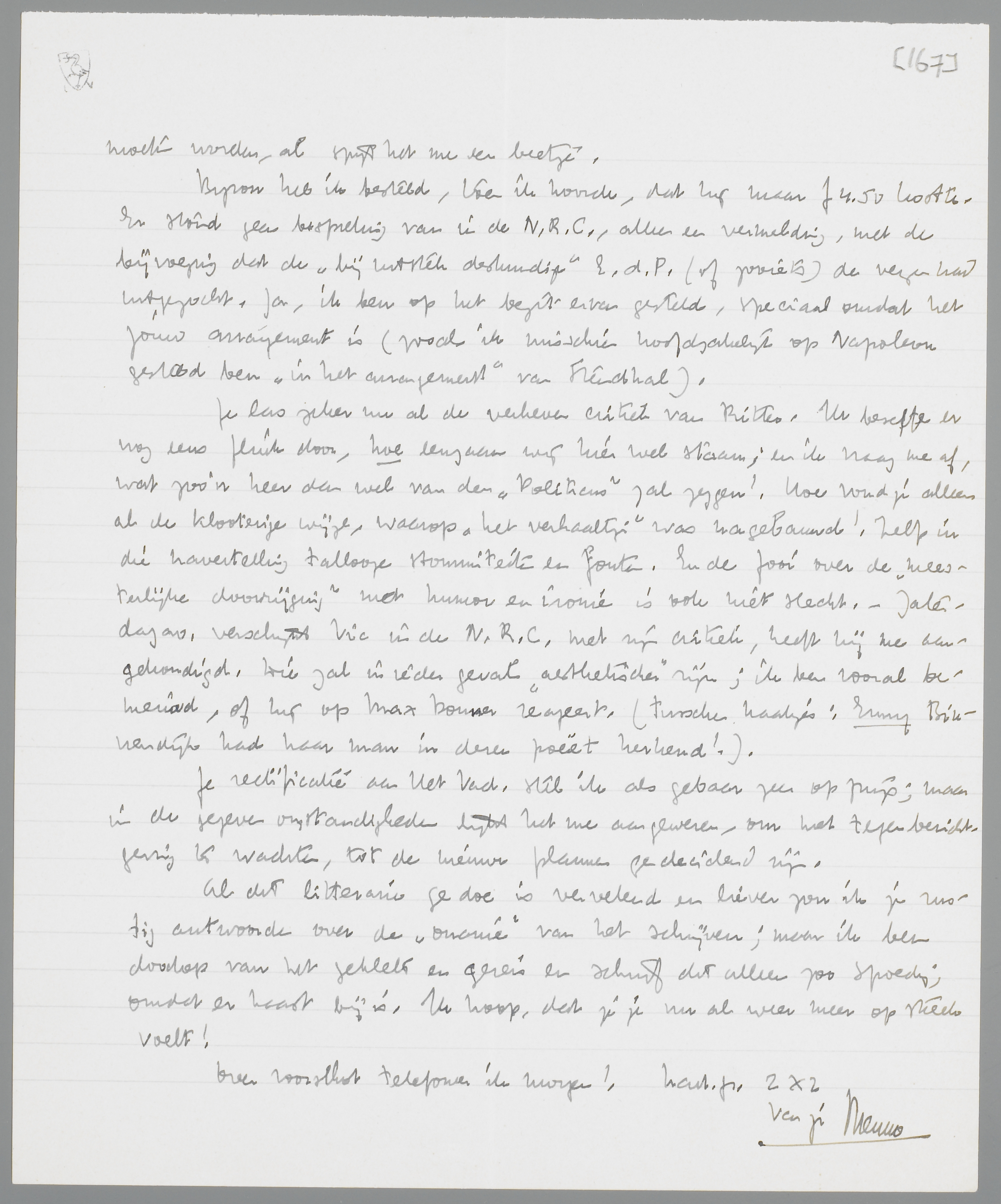 Je las zeker nu al de verheven critiek van Ritter. Ik besefte er nog eens flink door, hoe eenzaam wij hier wel staan; en ik vraag me af, wat zoo'n heer dan wel van den Politicus zal zeggen! Hoe vond je alleen al de klooterige wijze, waarop ‘het verhaaltje’ was nagebauwd! Zelfs in die navertelling tallooze stommiteiten en fouten. En de fooi over de ‘meesterlijke doorrijging’ met humor en ironie is ook niet slecht. - Zaterdagav. verschijnt Vic in de N.R.C. met zijn critiek, heeft hij me aangekondigd. Die zal in ieder geval ‘aesthetischer’ zijn; ik ben vooral benieuwd, of hij op Max Donner reageert. (tusschen haakjes: Enny Binnendijk had haar man in dezen poëet herkend!)