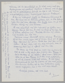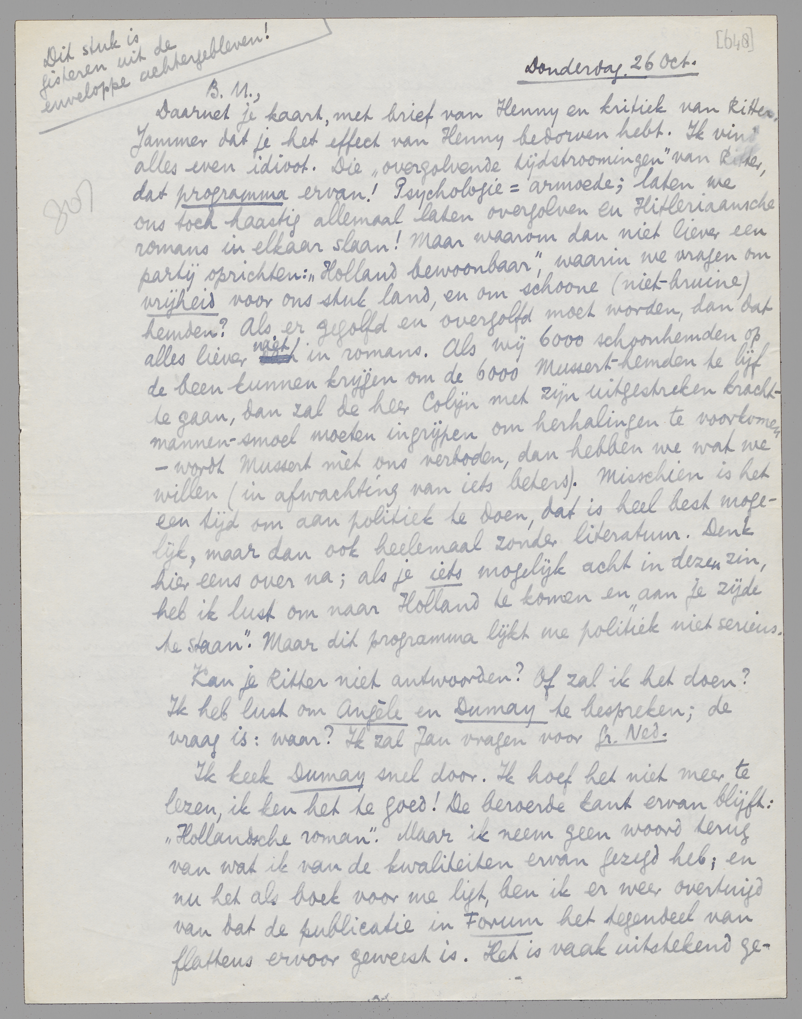 Daarnet je kaart, met brief van Henny en kritiek van Ritter. Jammer dat je het effect van Henny bedorven hebt. Ik vind alles even idioot. Die ‘overgolvende tijdstroomingen’ van Ritter, dat programma ervan! Psychologie = armoede; laten we ons toch haastig allemaal laten overgolven en Hitleriaansche romans in elkaar slaan! Maar waarom dan niet liever een partij oprichten: ‘Holland bewoonbaar’, waarin we vragen om vrijheid voor ons stuk land, en om schoone (niet-bruine) hemden? Als er gegolfd en overgolfd moet worden, dan dat alles liever niet in romans. Als wij 6000 schoonhemden op de been kunnen krijgen om de 6000 Mussert-hemden te lijf te gaan, dan zal de heer Colijn met zijn uitgestreken krachtmannen-smoel moeten ingrijpen om herhalingen te voorkomen - wordt Mussert mèt ons verboden, dan hebben we wat we willen (in afwachting van iets beters). Misschien is het een tijd om aan politiek te doen, dat is heel best mogelijk, maar dan ook heelemaal zonder literatuur. Denk hier eens over na; als je iets mogelijk acht in dezen zin, heb ik lust om naar Holland te komen en ‘aan je zijde te staan’. Maar dit programma lijkt me politiek niet serieus.