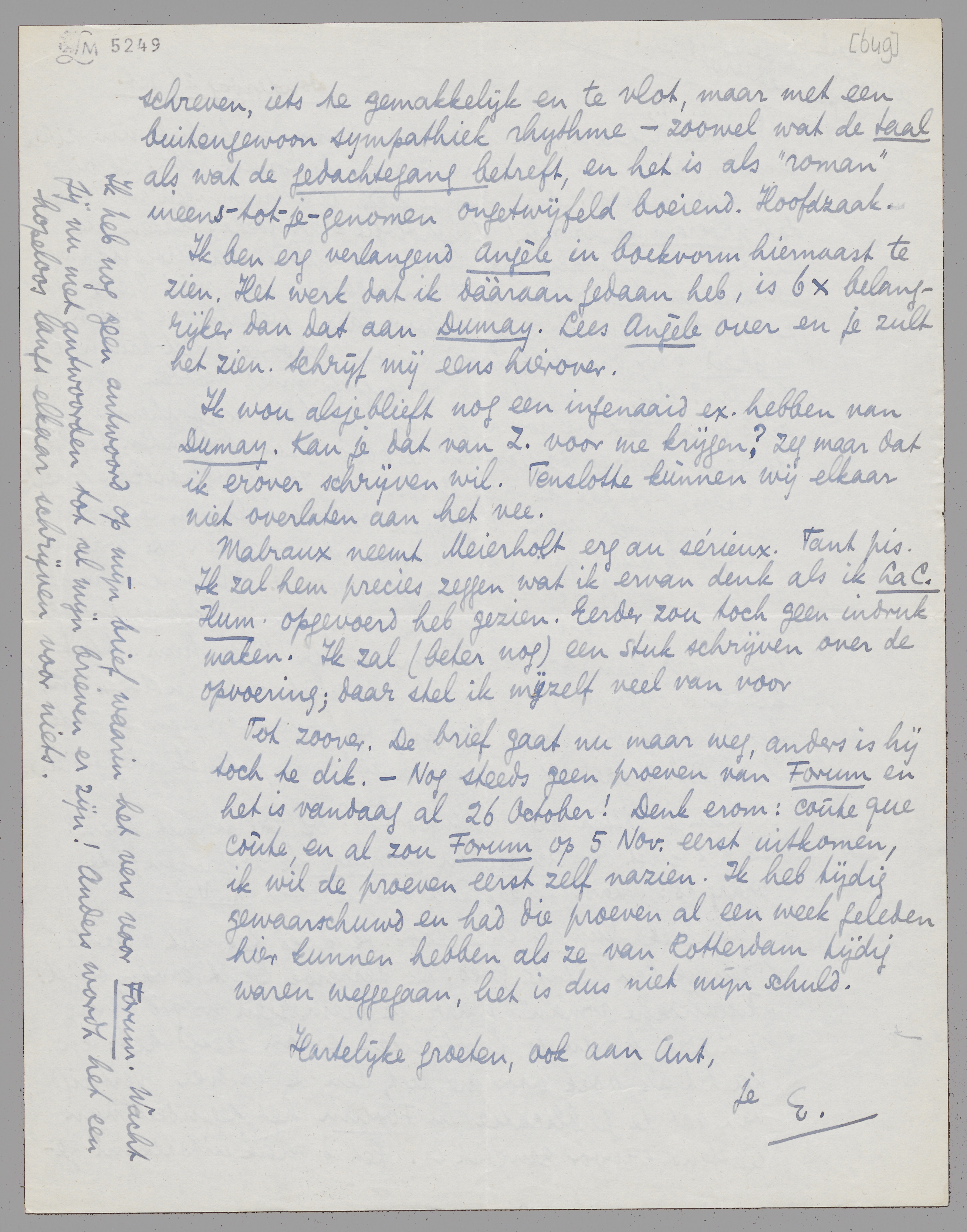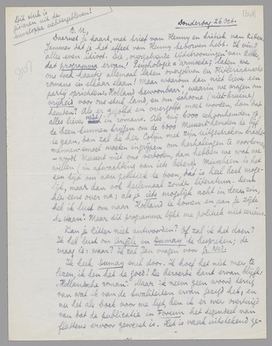 Tot zoover. De brief gaat nu maar weg, anders is hij toch te dik. - Nog steeds geen proeven van Forum en het is vandaag al 26 October! Denk erom: coûte que coûte, en al zou Forum op 5 nov. eerst uitkomen, ik wil de proeven eerst zelf nazien. Ik heb tijdig gewaarschuwd en had die proeven al een week geleden hier kunnen hebben als ze van Rotterdam tijdig waren weggegaan, het is dus niet mijn schuld.