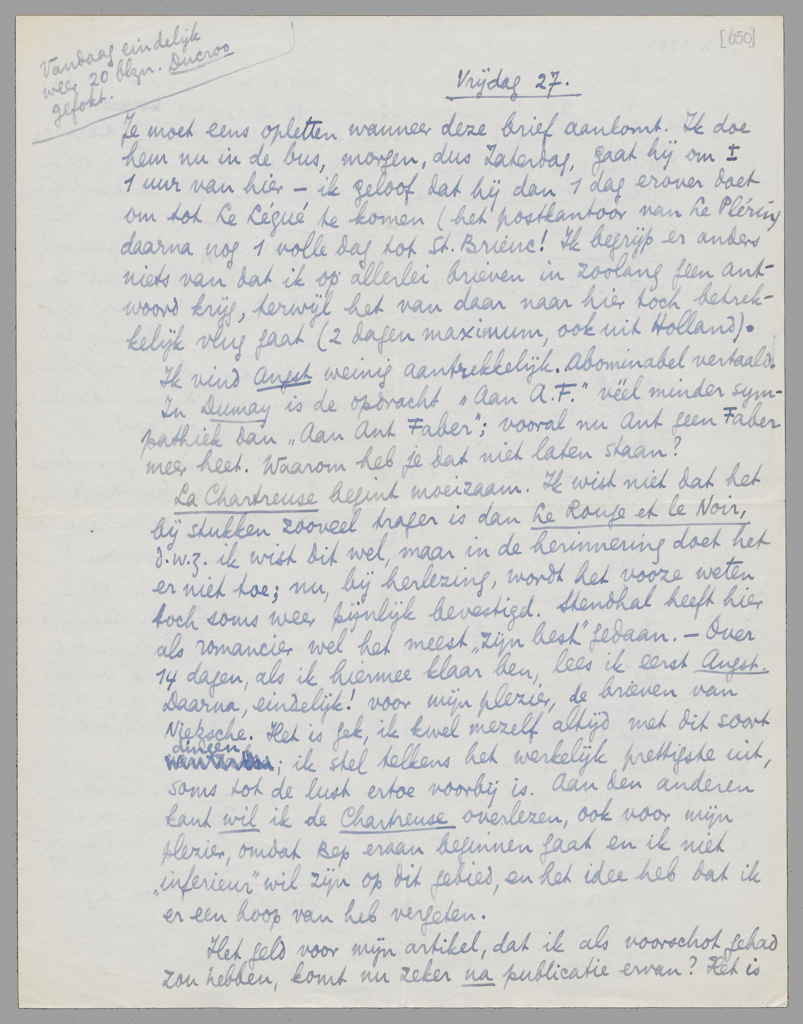 La Chartreuse begint moeizaam. Ik wist niet dat het bij stukken zooveel trager is dan Le Rouge et le Noir, d.w.z. ik wist dit wel, maar in de herinnering doet het er niet toe; nu, bij herlezing, wordt het vooze weten toch soms weer pijnlijk bevestigd. Stendhal heeft hier als romancier wel het meest ‘zijn best’ gedaan. - Over 14 dagen, als ik hiermee klaar ben, lees ik eerst Angst. Daarna, eindelijk! voor mijn plezier, de brieven van Nietzsche. Het is gek, ik kwel mezelf altijd met dit soort dingen; ik stel telkens het werkelijk prettigste uit, soms tot de lust ertoe voorbij is. Aan den anderen kant wil ik de Chartreuse overlezen, ook voor mijn plezier, omdat Bep eraan beginnen gaat en ik niet ‘inferieur’ wil zijn op dit gebied, en het idee heb dat ik er een hoop van heb vergeten.