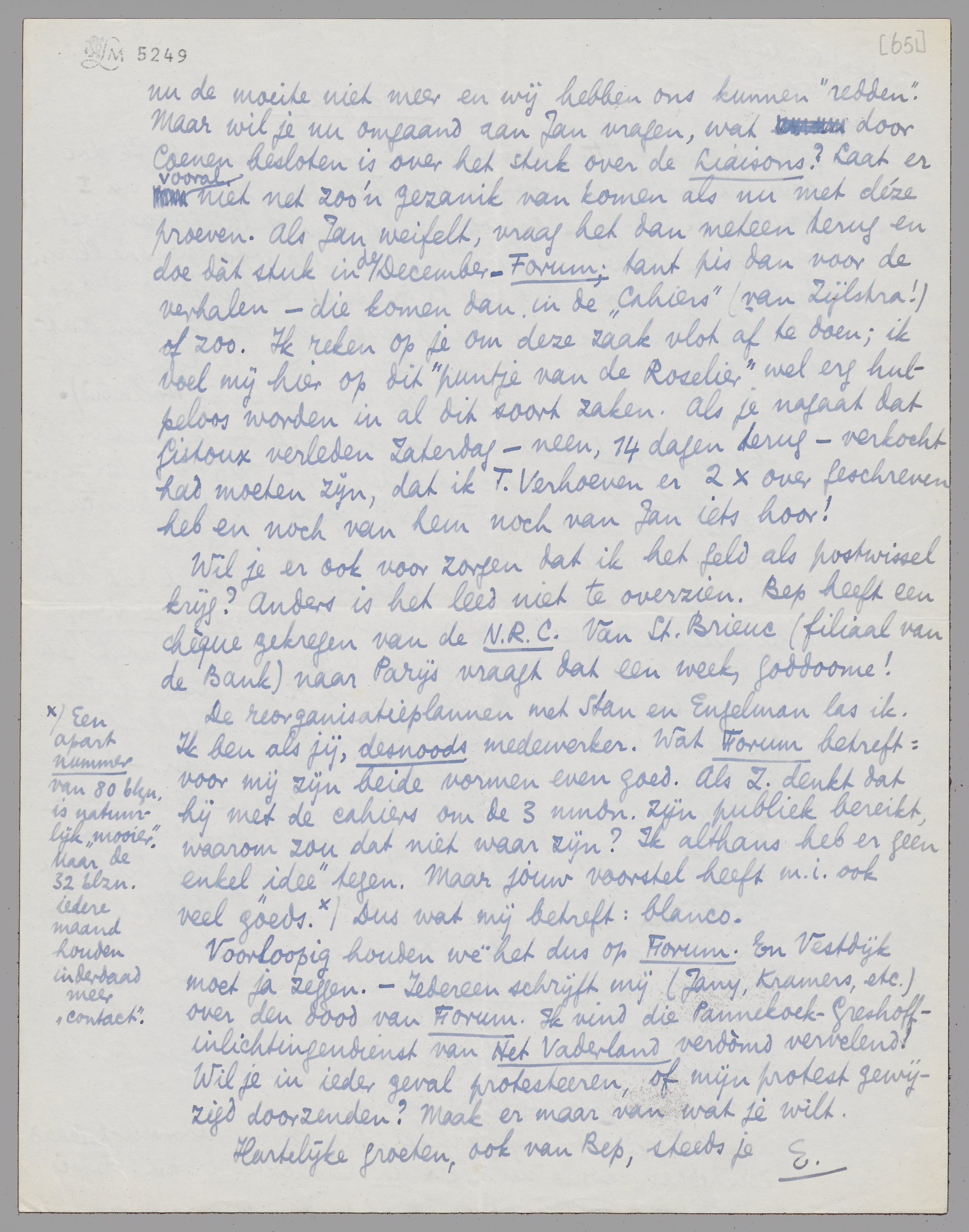 De reorganisatieplannen met Stan en Engelman las ik. Ik ben als jij, desnoods medewerker. Wat Forum betreft: voor mij zijn beide vormen even goed. Als Z. denkt dat hij met de cahiers om de 3 mndn. zijn publiek bereikt, waarom zou dat niet waar zijn? Ik althans heb er geen enkel ‘idee’ tegen. Maar jouw voorstel heeft m.i. ook veel goeds. Een apart nummer van 80 blzn. is natuurlijk ‘mooier’. Maar de 32 blzn. iedere maand houden inderdaad meer ‘contact’. Dus wat mij betreft: blanco.