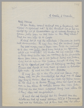 Bep gaat morgen voor 3 dagen naar Parijs om voorraad op te doen voor jullie. (Denk erom dat je je nu tegenover Schilt niet verspreekt!) Wij denken dat wij uiterlijk 1 Dec. in Parijs terug zullen zijn, en voorloopig op één gemeubelde kamer gaan wonen, tot er iets gebeurt hetzij met Gistoux, hetzij met de erfenis. Wat Gistoux betreft: ik kreeg van de Mij die hypotheek gaf mijn 3e bedreiging vandaag. Wat Timmers doet begrijp ik niet, maar ik wacht in betrekkelijke vrede. Ik werk nu weer aan Ducroo.