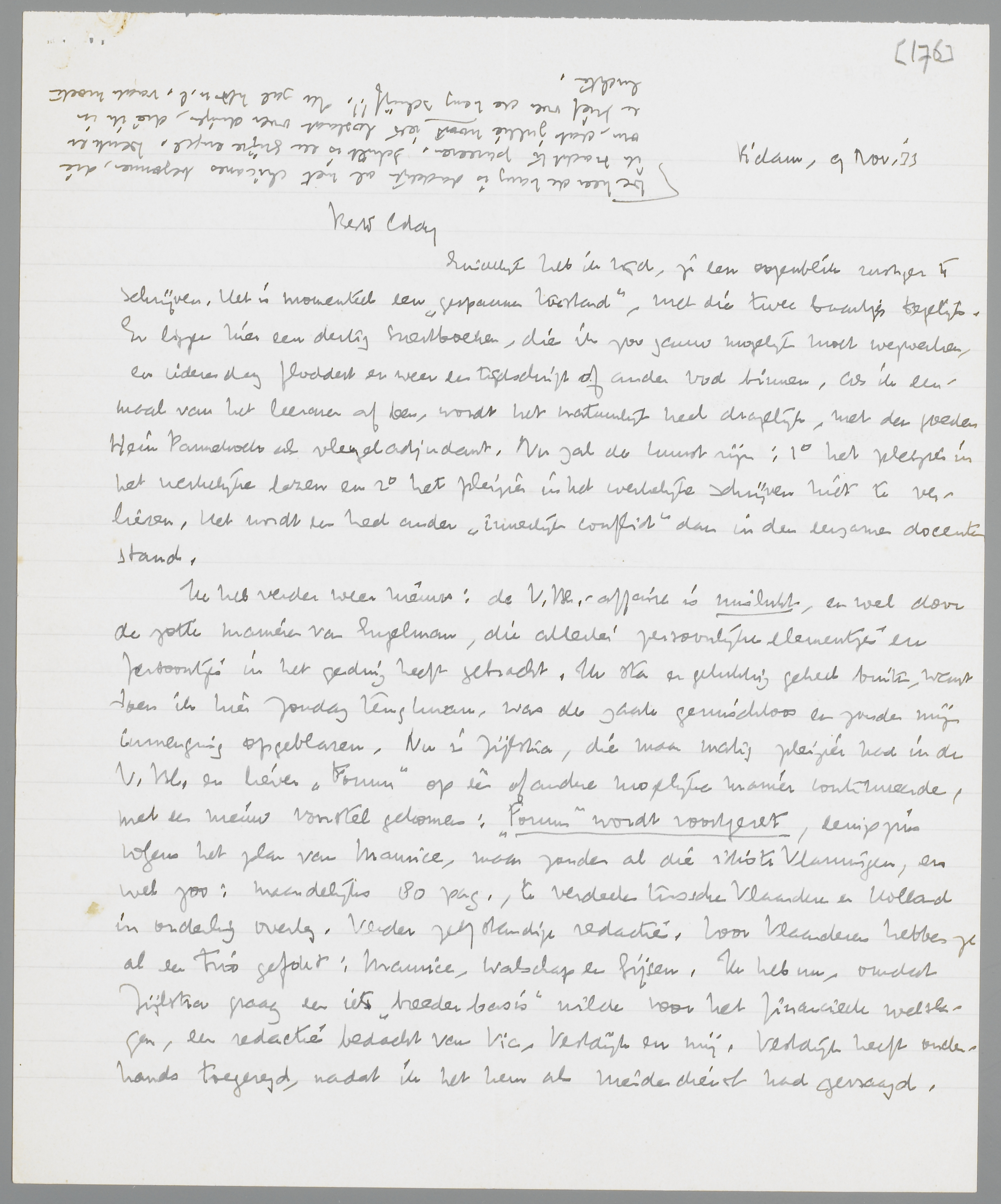 Ik heb verder weer nieuws: de V. Bl.-affaire is mislukt, en wel door de zotte manieren van Engelman, die allerlei persoonlijke elementjes en persoontjes in het geding heeft gebracht. Ik sta er gelukkig geheel buiten, want toen ik hier Zondag terugkwam, was de zaak geruischloos en zonder mijn inmenging opgeblazen. Nu is Zijlstra, die maar matig pleizier had in de V. Bl. en liever Forum op één of andere mogelijke manier continueerde, met een nieuw voorstel gekomen; Forum wordt voortgezet, eenigszins volgens het plan van Maurice, maar zonder al die idiote Vlamingen, en wel zoo: maandelijks 80 pag., te verdeelen tusschen Vlaanderen en Holland in onderling overleg. Verder zelfstandige redactie. Voor Vlaanderen hebben ze al een trio gefokt: Maurice, Walschap en Gijsen. Ik heb nu, omdat Zijlstra graag een iets ‘breeder basis’ wilde voor het financieele welslagen, een redactie bedacht van Vic, Vestdijk en mij. Vestdijk heeft onderhands toegezegd, nadat ik het hem als vriendendienst had gevraagd. Vic zal het ook wel doen. In deze formatie is er toch een ‘Forum-meerderheid’ in den ouden zin. Lijkt het je, gegeven de omstandigheden, niet geschikt zoo? - De reden van Zijlstra's nieuwe poging is, dat hij serieus kans schijnt te hebben op minstens 200 Vlaamsche abonné's. Gaat dus dit plan eindelijk eens door, dan behoeven in Dec. geen afscheid te nemen, maar alleen een wijziging in den opzet aan te kondigen; en we blijven baas in eigen huis. Schrijf mij je meening vooral. (Ik stuur je de verhalen nu niet terug, de Liaisons heb ik hier al).