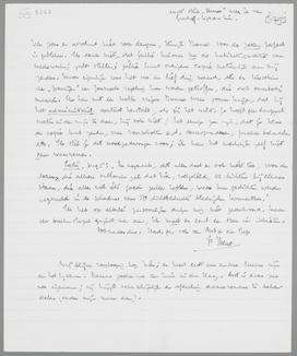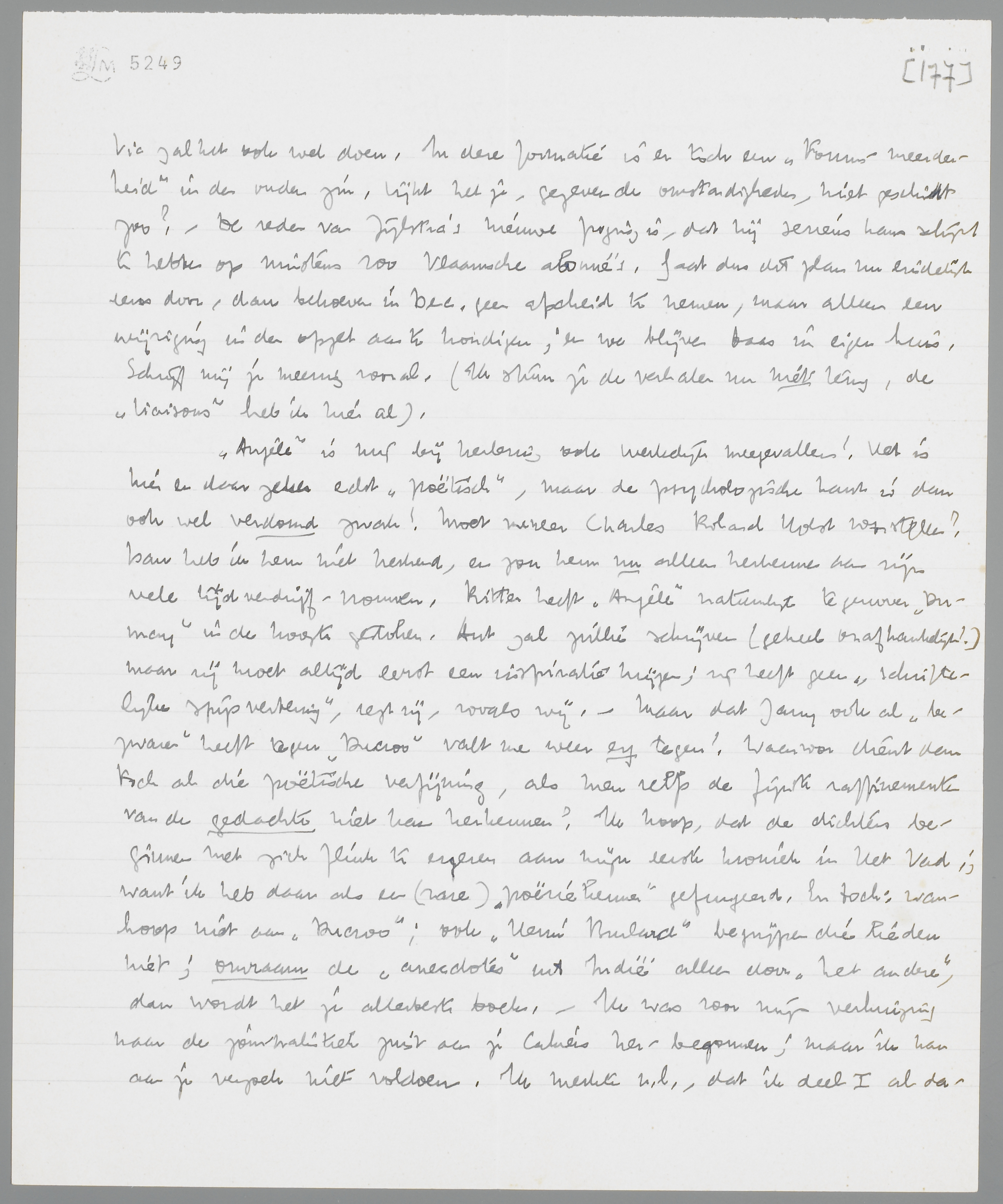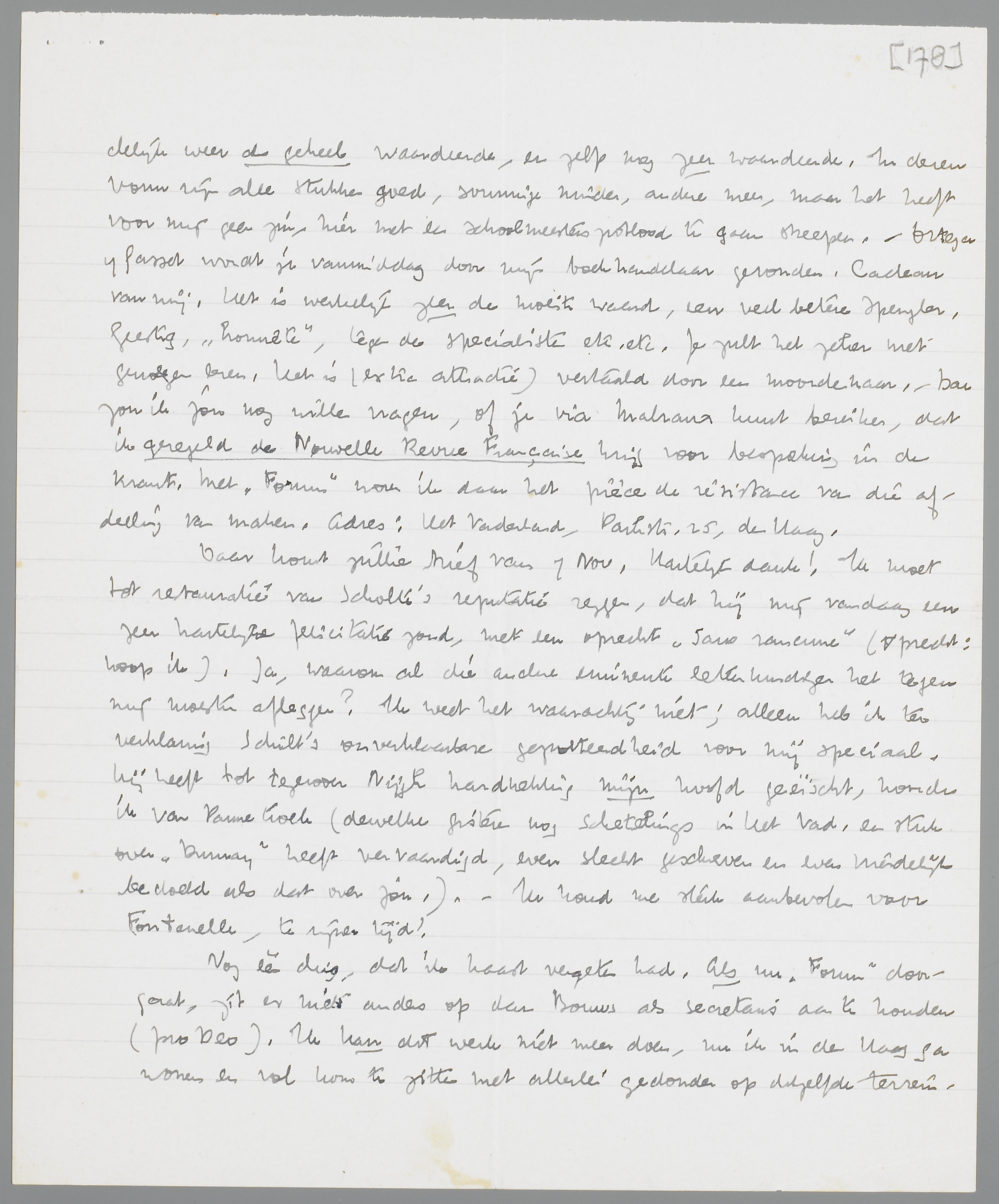 Angèle is mij bij herlezing ook werkelijk meegevallen! Het is hier en daar echt ‘poëtisch’, maar de psychologische kant is dan ook wel verdomd zwak! Moet meneer Charles Roland Holst voorstellen? Dan heb ik hem niet herkend, en zou hem nu alleen herkennen aan zijn vele tijdverdrijf-vrouwen. Ritter heeft Angèle natuurlijk tegenover Dumay in de hoogte gestoken. Ant zal jullie schrijven (geheel onafhankelijk!) maar zij moet altijd eerst een inspiratie krijgen; zij heeft geen ‘schriftelijke spijsvertering’, zegt zij, zooals wij. - Maar dat Jany ook al ‘bezwaren’ heeft tegen Ducroo valt me weer erg tegen! Waarvoor dient dan toch al die poëtische verfijning, als men zelfs de fijnste raffinementen van de gedachte niet kan herkennen? Ik hoop, dat de dichters beginnen met zich flink te ergeren aan mijn eerste kroniek in Het Vad., want ik heb daar als een (rare) ‘poëziekenner’ gefungeerd. En toch: wanhoop niet aan Ducroo; ook Henri Brulard begrijpen die lieden niet; omraam de ‘anecdotes’ uit Indië alleen door ‘het andere’, dan wordt het je allerbeste boek. - Ik was voor mijn verhuizing naar de journalistiek juist aan je Cahiers her-begonnen; maar ik kan aan je verzoek niet voldoen. Ik merkte n.l., dat ik deel I al dadelijk weer als geheel waardeerde, en zelfs nog zeer waardeerde. In dezen vorm zijn alle stukken goed, sommige minder, andere meer, maar het heeft voor mij geen zin, hier met een schoolmeesterspotlood te gaat streepen. - Ortega y Gasset wordt je vanmiddag door mijn boekhandelaar gezonden. Cadeau van mij. Het is werkelijk zeer de moeite waard, een veel betere Spengler. Geestig, ‘honnête’, tegen de specialisten etc. etc. Je zult het zeker met genoegen lezen. Het is (extra attractie) vertaald door een moordenaar. - Dan zou ik jou nog willen vragen, of je via Malraux kunt bereiken, dat ik geregeld de Nouvelle Revue Française krijg voor bespreking in de krant. Met Forum wou ik daar het pièce de résistance van die afdeeling van maken. Adres: Het Vaderland, Parkstr. 25, den Haag.
