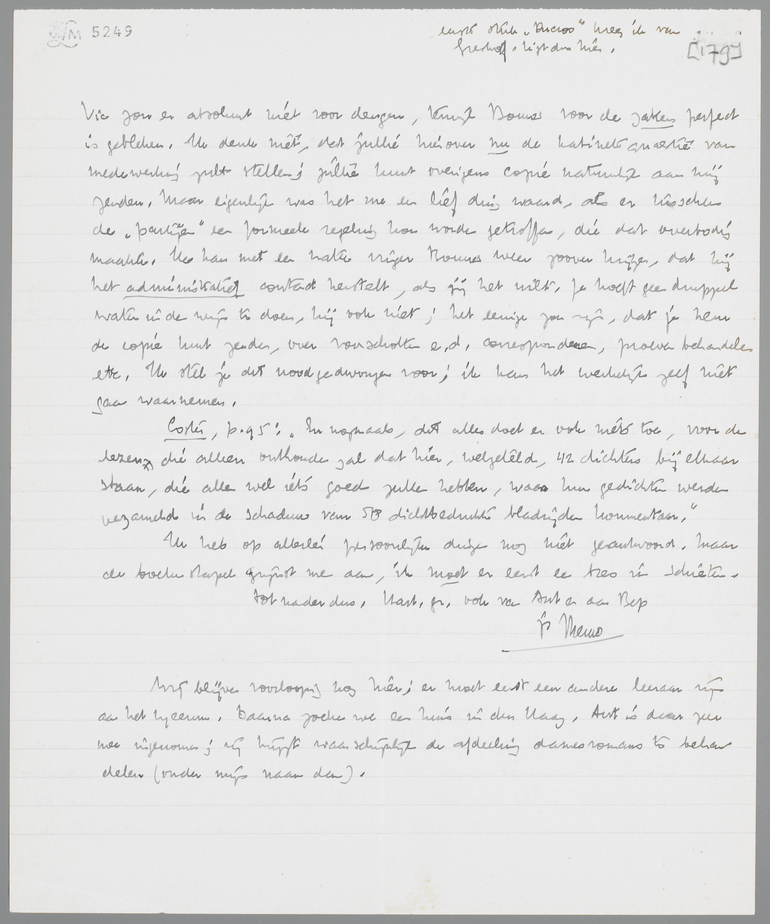Nog één ding, dat ik haast vergeten had. Als nu Forum doorgaat, zit er niets anders op dan Bouws als secretaris aan te houden (pro Deo). Ik kan dit werk niet meer doen, nu ik in den Haag ga wonen en vol kom te zitten met allerlei gedonder op ditzelfde terrein. Vic zou er absoluut niet voor deugen, terwijl Bouws voor de zaken perfect is gebleken. Ik denk niet, dat jullie hierover nu de kabinetsquaestie van medewerking zult stellen; jullie kunt overigens copie natuurlijk aan mij zenden. Maar eigenlijk was het me een lief ding waard, als er tusschen de ‘partijen’ een formeele regeling kon worden getroffen, die dat overbodig maakte. Ik kan met een natte vinger Bouws weer zoover krijgen, dat hij het administratief contact herstelt, als jij het wilt. Je hoeft geen druppel water in den wijn te doen, hij ook niet; het eenige zou zijn, dat je hem de copie kunt zenden, over voorschotten e.d. correspondeeren, proeven behandelen etc. Ik stel je dit noodgedwongen voor; ik kan het werkelijk zelf niet gaan waarnemen.