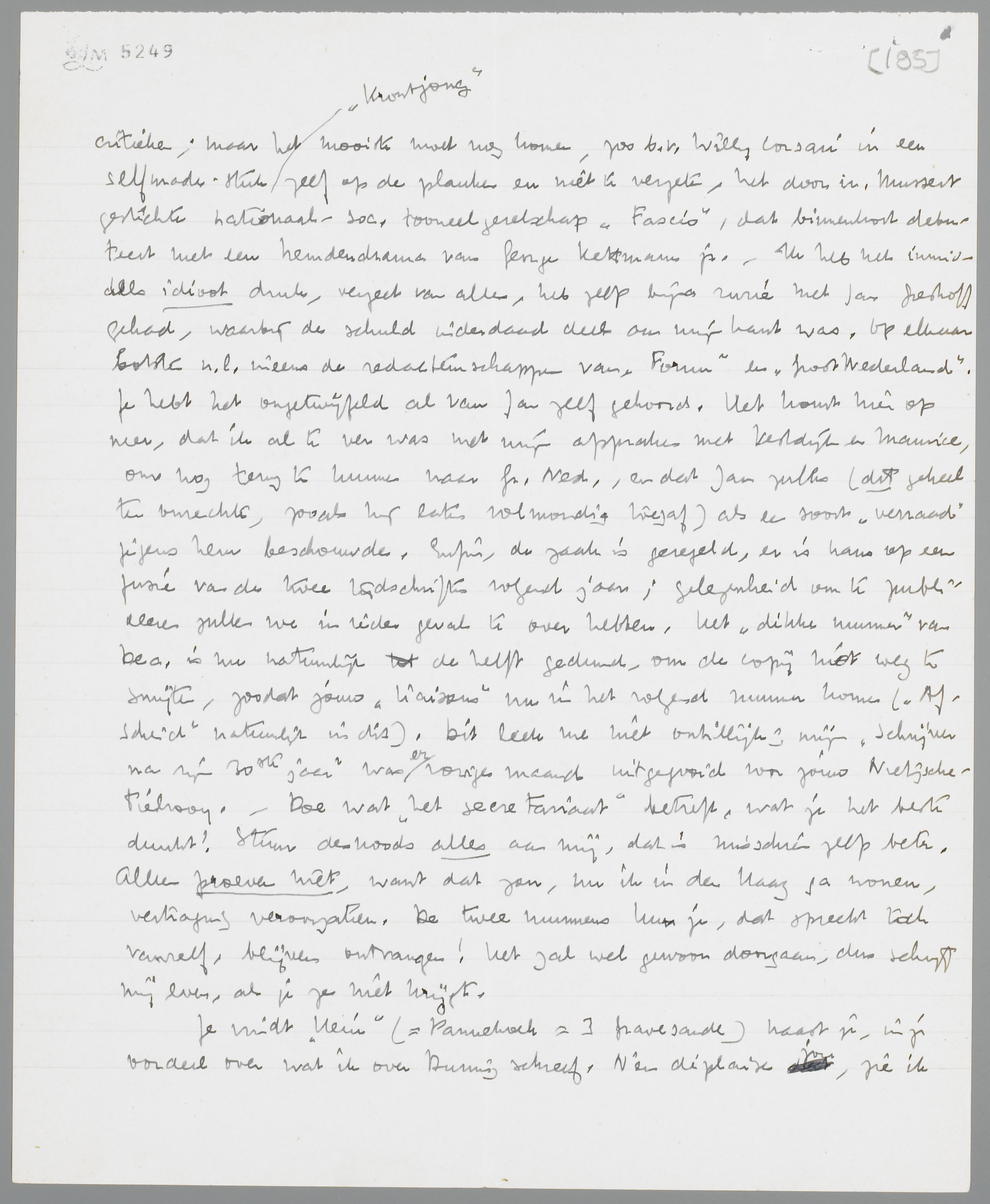 Waarom Anthonie uitgesammeld is, weet ik niet (de ruime man krijgt, denk ik, vage sympathieën ook voor Hitler!) en wien dr. Brouwer gekocheld heeft, ([onleesbaar] deed het, naar het schijnt, om zijn broer van een chantagepleger te bevrijden), ook niet. Maar Greshoff weet er meer van; hij beschrijft hem als een soort Raskolnikov. Ik vind overigens, dat Raskolnikov Ortéga niet slecht vertaald heeft; wat stijf misschien, maar toch erg helder.
