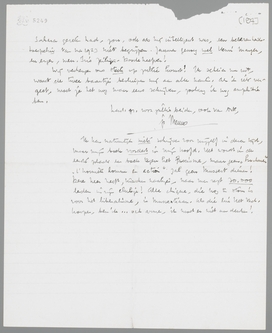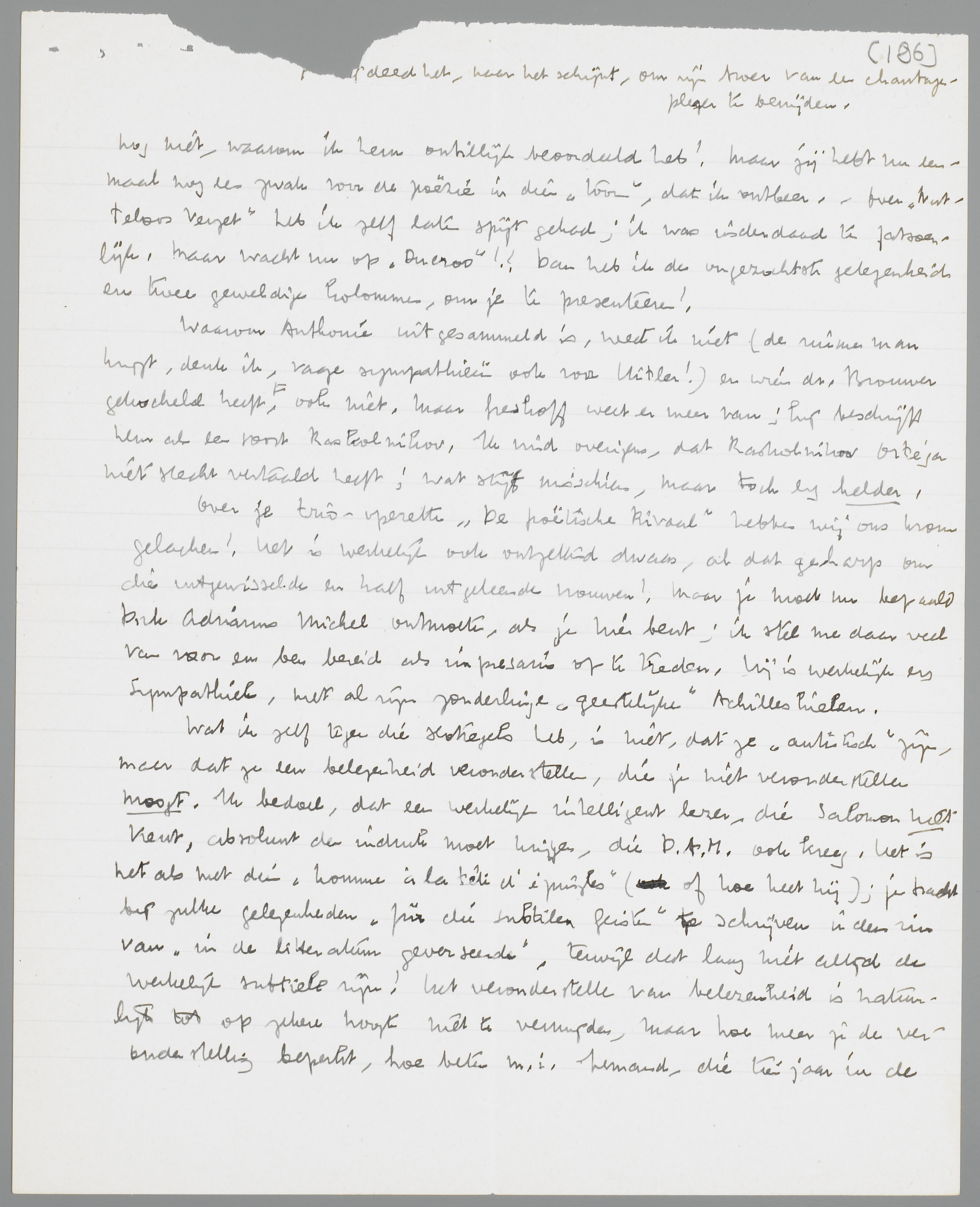 Over je trio-operette ‘De poëtische Rivaal’ hebben wij ons krom gelachen! Het is werkelijk ook ontzettend dwaas, al dat geharp om die uitgewisselde en half uitgeleende vrouwen! Maar je moet nu bepaald Dirk Adrianus Michel ontmoeten, als je hier bent; ik stel me daar veel van voor en ben bereid als impressario op te treden. Hij is werkelijk erg sympathiek, met al zijn zonderlinge ‘geestelijke’ Achilleshielen.