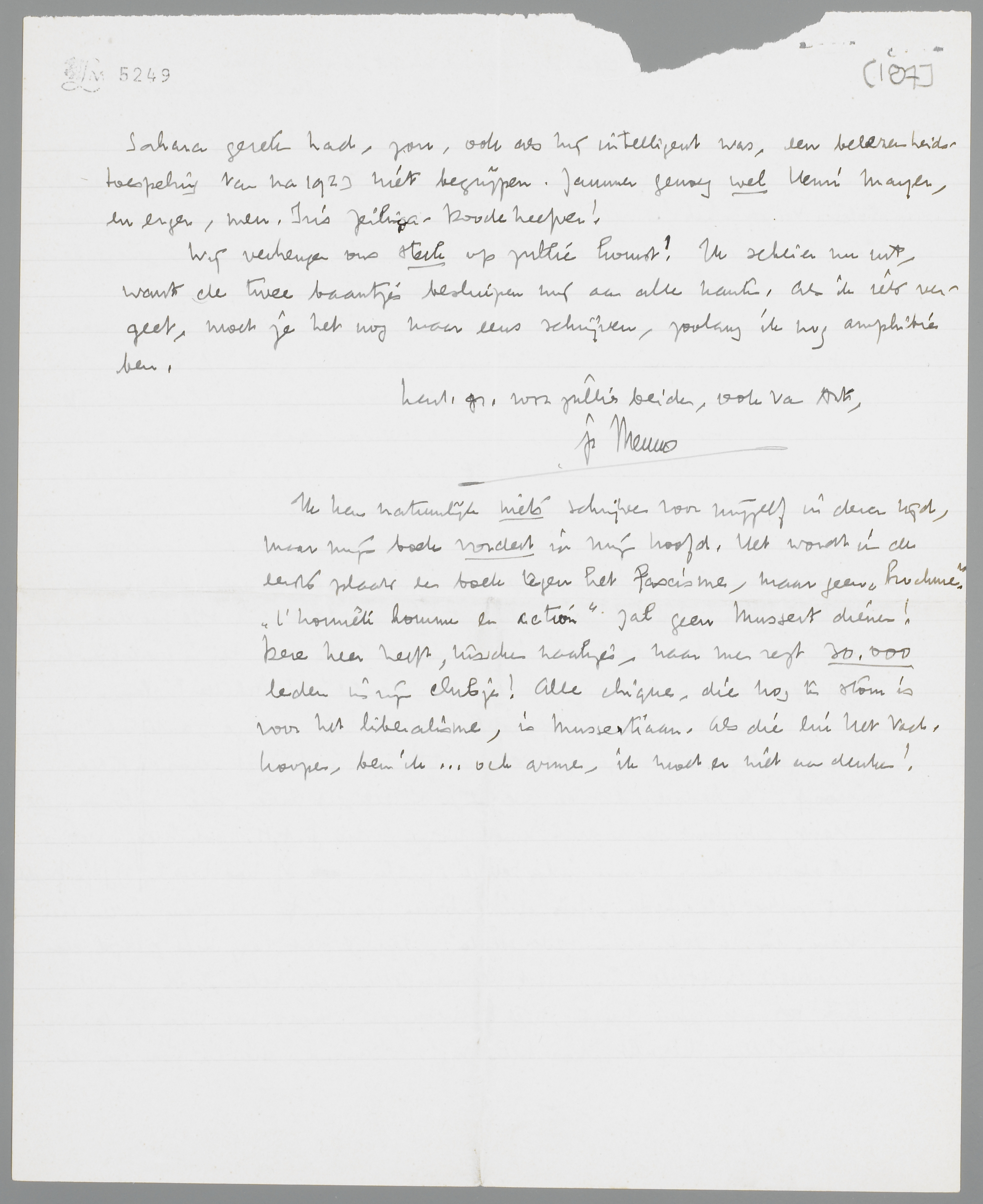 Ik kan natuurlijk niets schrijven voor mijzelf in dezen tijd, maar mijn boek vordert in mijn hoofd. Het wordt in de eerste plaats een boek tegen het fascisme, maar geen ‘brochure’, ‘l'honnête homme en action’ zal geen Mussert dienen! Deze heer heeft, tusschen haakjes, naar men zegt 30.000 leden in zijn clubje! Alle chique, die nog te stom is voor het liberalisme, is Mussertiaan. Als die lui Het Vad. koopen, ben ik... och arme, ik moet er niet aan denken!