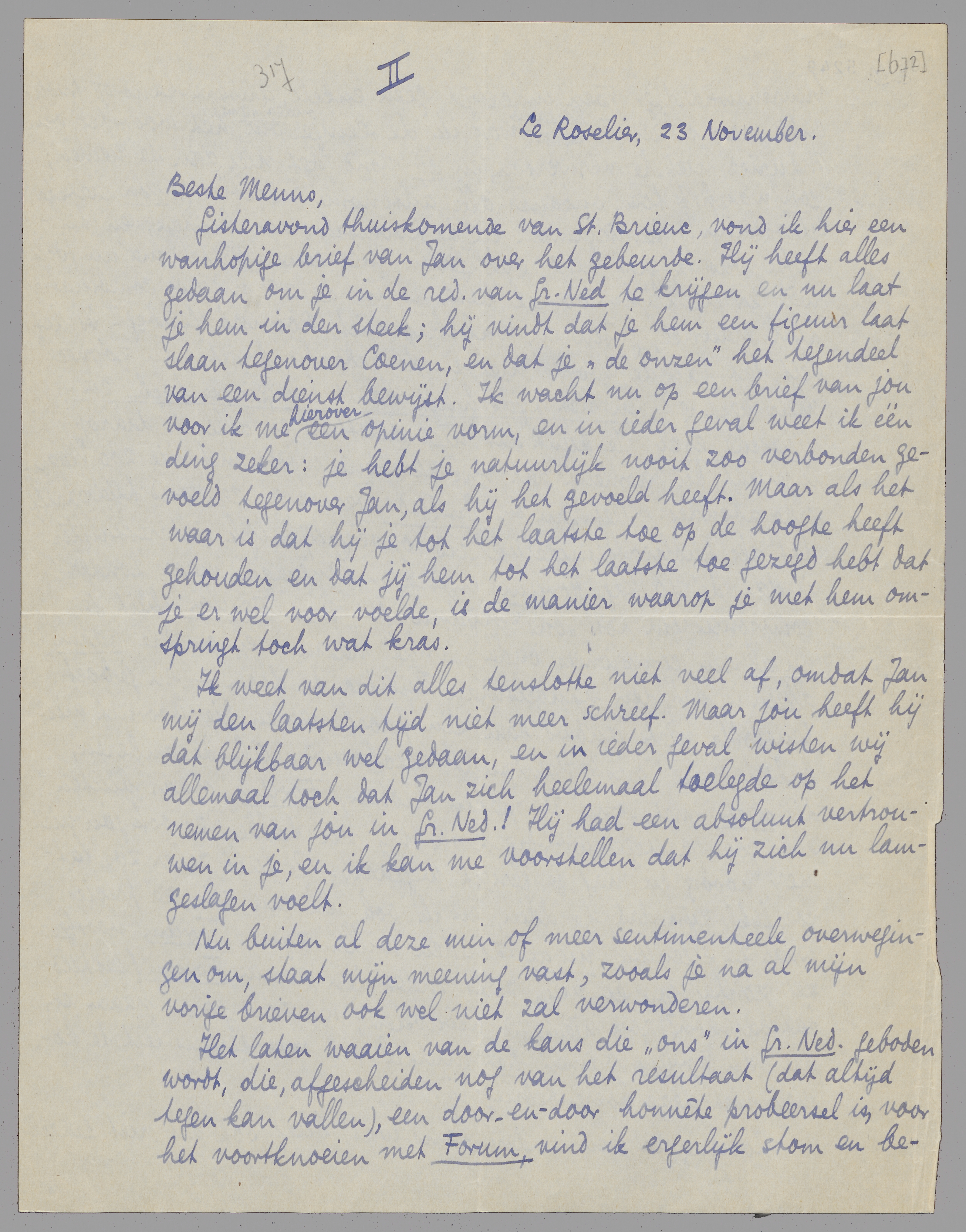 Er kwam een luchtpostbrief van Jan, die ik haastig heb ingezien en die hierbij gaat. Ik vond het nu eerst onnoodig om je mijn brief van gisteren te zenden. Maar après tout - juist wel. Deze affaire heeft me helder doen inzien met welke gevoelens ik tegenover Forum '34 sta; het is beter dat je die weet.