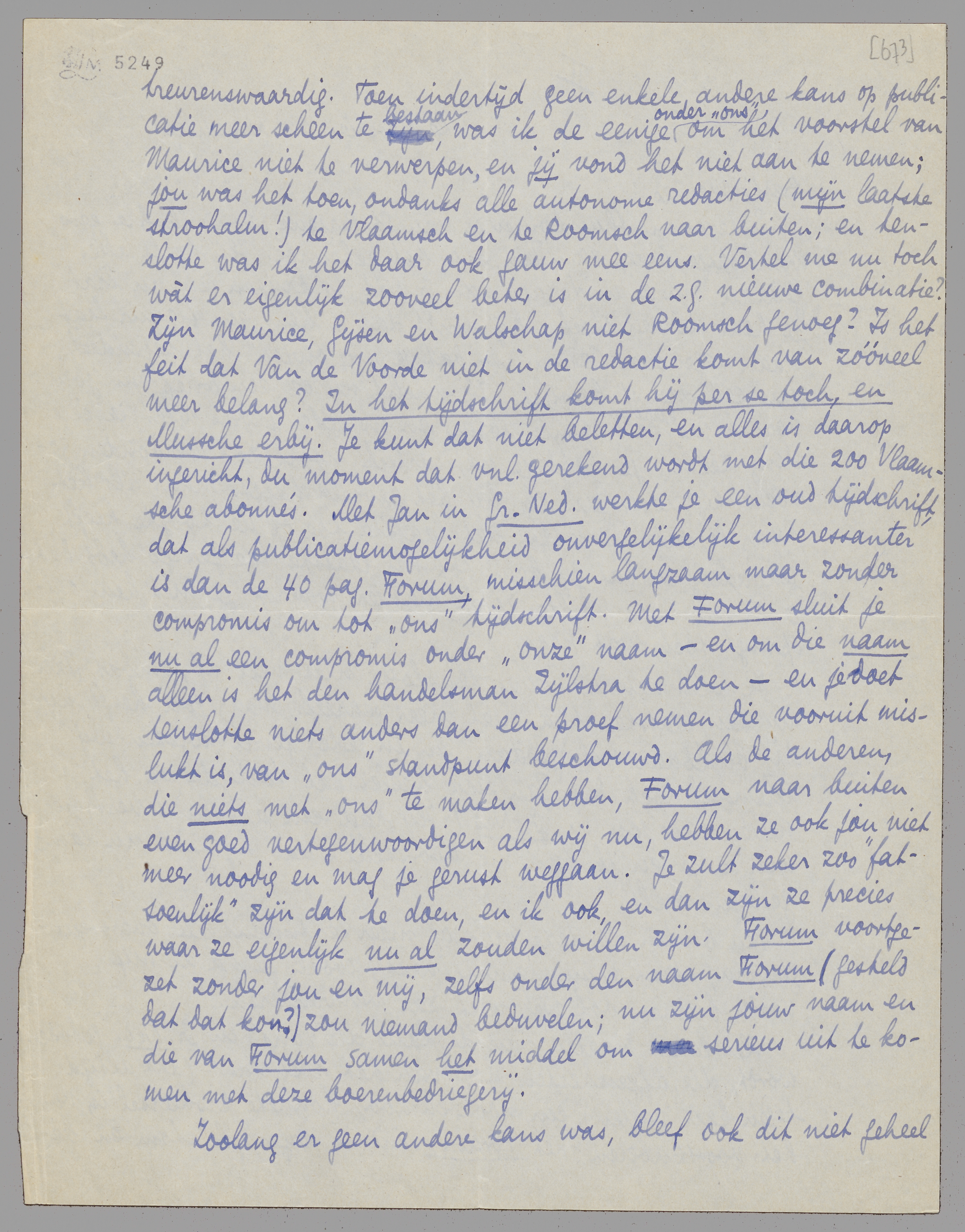 Het laten waaien van de kans die ‘ons’ in Gr. Ned. geboden wordt, die, afgescheiden nog van het resultaat (dat altijd tegen kan vallen), een door-en-door honnête probeersel is, voor het voortknoeien met Forum, vind ik ergerlijk stom en betreurenswaardig. Toen indertijd geen enkele andere kans op publicatie meer scheen te bestaan, was ik de eenige onder ‘ons’ om het voorstel van Maurice niet te verwerpen, en jij vond het niet aan te nemen; jou was het toen, ondanks alle autonome redacties (mijn laatste stroohalm!) te Vlaamsch en te Roomsch naar buiten; en tenslotte was ik het daar ook gauw mee eens. Vertel me nu toch wàt er eigenlijk zooveel beter is in de z.g. nieuwe combinatie? Zijn Maurice, Gijsen en Walschap niet Roomsch genoeg? Is het feit dat Van de Voorde niet in de redactie komt van zóóveel meer belang? In het tijdschrift komt hij per se toch, en Mussche erbij. Je kunt dat niet beletten, en alles is daarop ingericht, du moment dat vnl. gerekend wordt met die 200 Vlaamsche abonnés. Met Jan in Gr. Ned. werkte je een oud tijdschrift, dat als publicatiemogelijkheid onvergelijkelijk interessanter is dan de 40 pag. Forum, misschien langzaam maar zonder compromis om tot ‘ons’ tijdschrift. Met Forum sluit je nu al een compromis onder ‘onze’ naam - en om die naam alleen is het den handelsman Zijlstra te doen - en je doet tenslotte niets anders dan een proef nemen die vooruit mislukt is, van ‘ons’ standpunt beschouwd. Als de anderen, die niets met ‘ons’ te maken hebben, Forum naar buiten even goed vertegenwoordigen als wij nu, hebben ze ook jou niet meer noodig en mag je gerust weggaan. Je zult zeker zoo ‘fatsoenlijk’ zijn dat te doen, en ik ook, en dan zijn ze precies waar ze eigenlijk nu al zouden willen zijn. Forum voortgezet zonder jou en mij, zelfs onder den naam Forum (gesteld dat dat kon?) zou niemand beduvelen; nu zijn jouw naam en die van Forum samen het middel om serieus uit te komen met deze boerenbedriegerij.