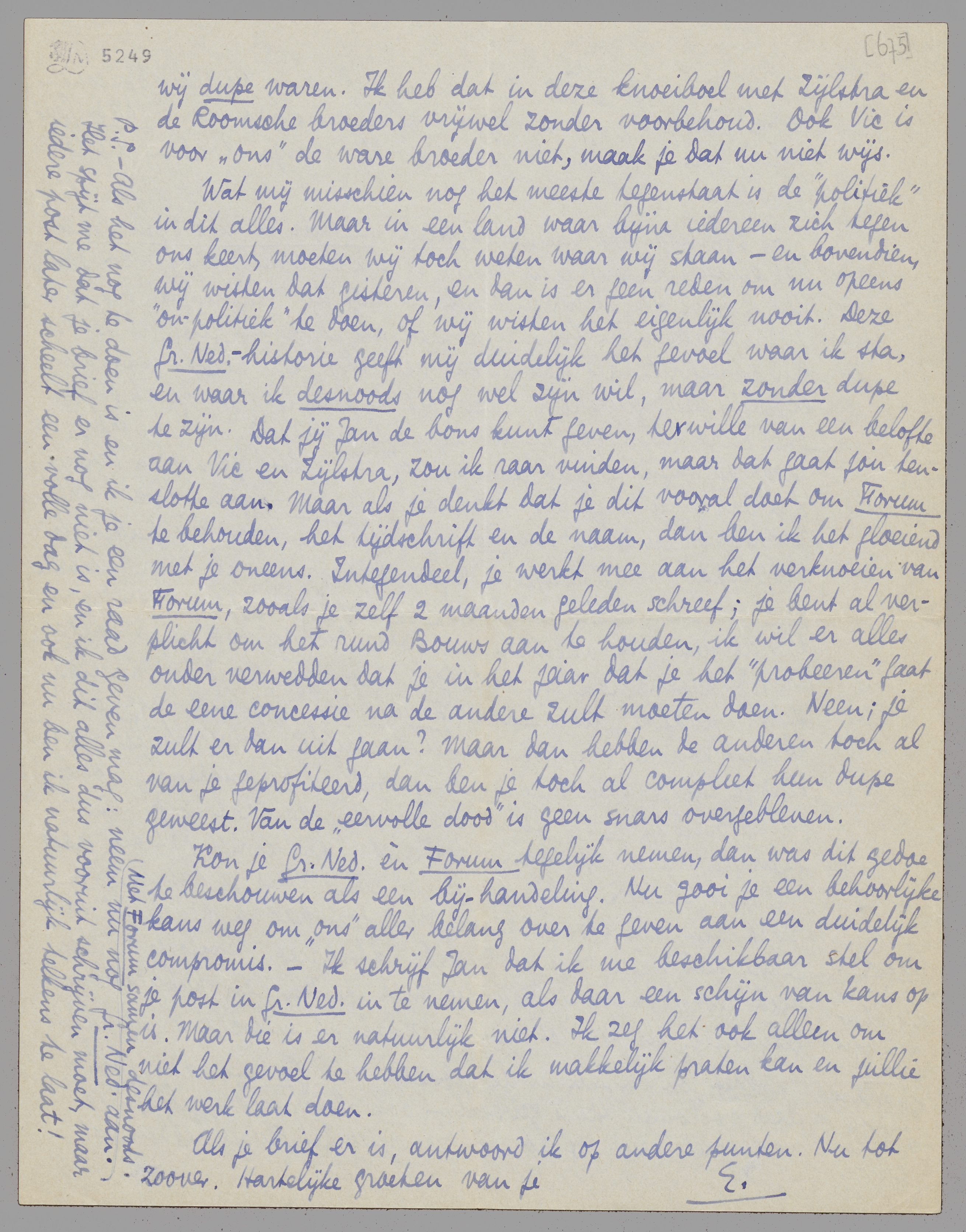 Wat mij misschien nog het meeste tegenstaat is de ‘politiek’ in dit alles. Maar in een land waar bijna iedereen zich tegen ons keert, moeten wij toch weten waar wij staan - en bovendien, wij wisten dat gisteren, en dan is er geen reden om nu opeens ‘on-politiek’ te doen, of wij wisten het eigenlijk nooit. Deze Gr. Ned-historie geeft mij duidelijk het gevoel waar ik sta, en waar ik desnoods nog wel zijn wil, maar zonder dupe te zijn. Dat jij Jan de bons kunt geven, terwille van een belofte aan Vic en Zijlstra, zou ik raar vinden, maar dat gaat jou tenslotte aan. Maar als je denkt dat je dit vooral doet om Forum te behouden, het tijdschrift en de naam, dan ben ik het gloeiend met je oneens. Integendeel, je werkt mee aan het verknoeien van Forum, zooals je zelf 2 maanden geleden schreef; je bent al verplicht om het rund Bouws aan te houden, ik wil er alles onder verwedden dat je in het jaar dat je het ‘probeeren’ gaat de eene concessie na de andere zult moeten doen. Neen; je zult er dan uit gaan? Maar dan hebben de anderen toch al van je geprofiteerd, dan ben je toch al compleet hun dupe geweest. Van de ‘eervolle dood’ is geen snars overgebleven.