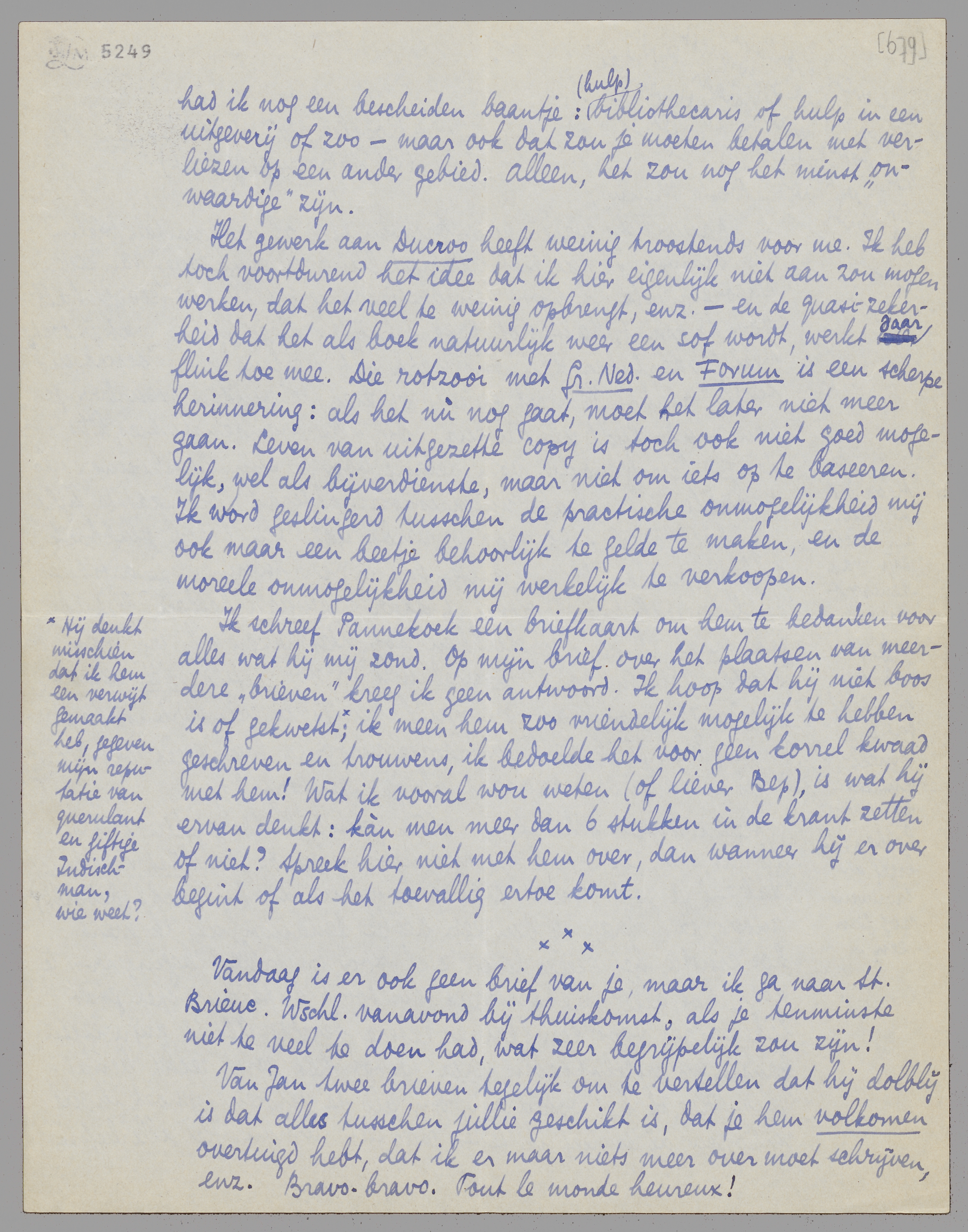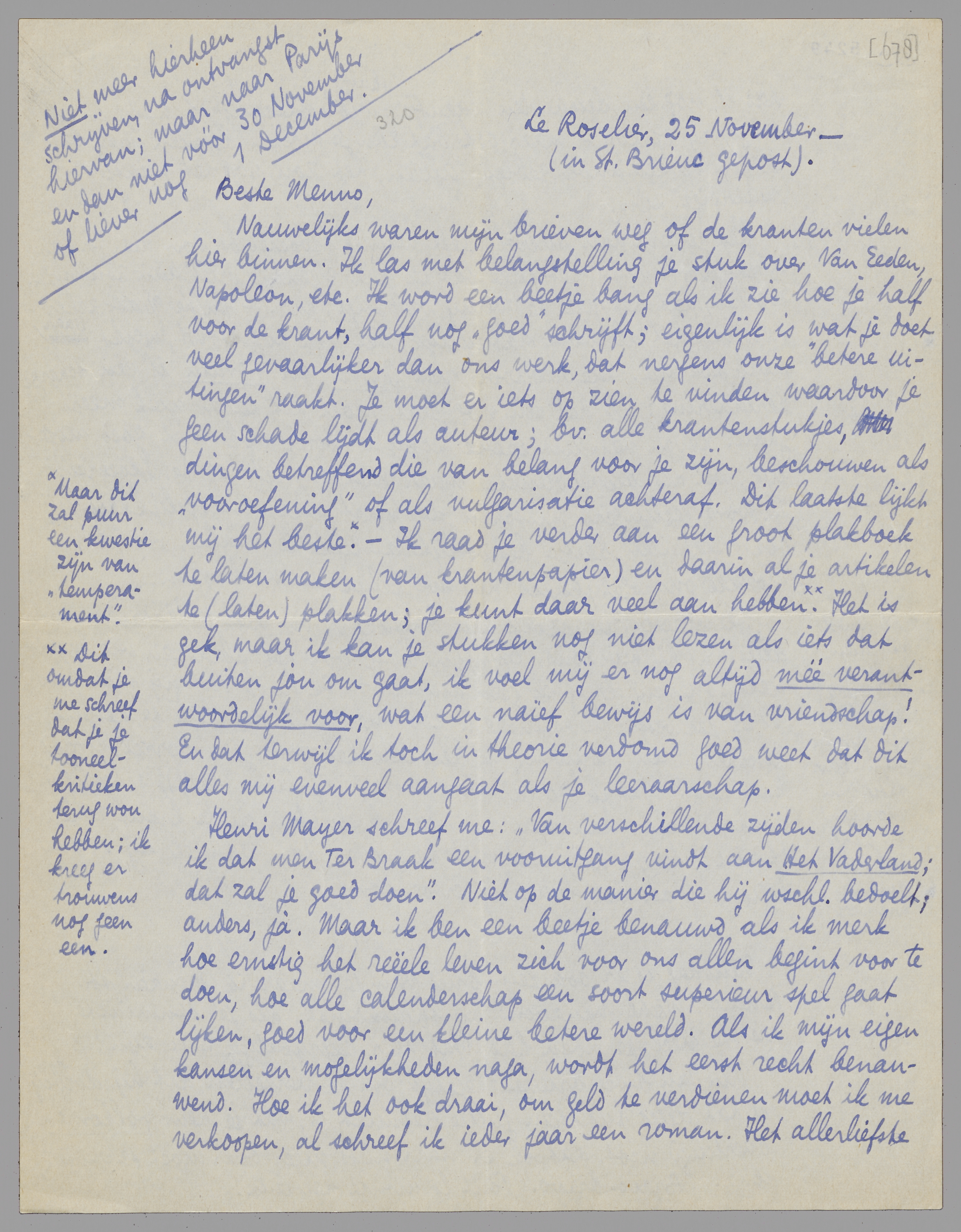 Nauwelijks waren mijn brieven weg of de kranten vielen hier binnen. Ik las met belangstelling je stuk over Van Eeden, Napoleon, etc. Ik word een beetje bang als ik zie hoe je half voor de krant, half nog ‘goed’ schrijft; eigenlijk is wat je doet veel gevaarlijker dan ons werk, dat nergens onze ‘betere uitingen’ raakt. Je moet er iets op zien te vinden waardoor je geen schade lijdt als auteur; bv. alle krantenstukjes, dingen betreffend die van belang voor je zijn, beschouwen als ‘vooroefening’ of als vulgarisatie achteraf. Dit laatste lijkt mij het beste. [Maar dit zal puur een kwestie zijn van ‘temperament’] Ik raad je verder aan een groot plakboek te laten maken (van krantenpapier) en daarin al je artikelen te (laten) plakken; je kunt daar veel aan hebben. [Dit omdat je me schreef dat je je toneelkritieken terug wou hebben; ik kreeg er trouwens nog geen een.] Het is gek, maar ik kan je stukken nog niet lezen als iets dat buiten jou om gaat, ik voel mij er nog altijd méé verantwoordelijk voor, wat een naïef bewijs is van vriendschap! En dat terwijl ik toch in theorie verdomd goed weet dat dit alles mij evenveel aangaat als je leeraarschap.