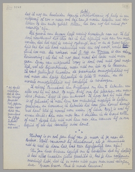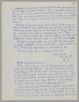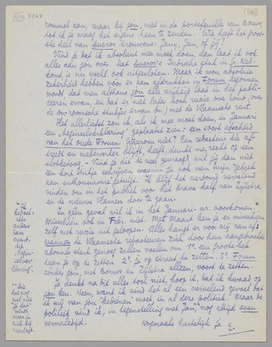 Ik schreef Pannekoek een briefkaart om hem te bedanken voor alles wat hij mij zond. Op mijn brief over het plaatsen van meerdere ‘brieven’ kreeg ik geen antwoord. Ik hoop dat hij niet boos is of gekwetst*; ik meen hem zoo vriendelijk mogelijk te hebben geschreven en trouwens, ik bedoelde het voor geen korrel kwaad met hem! Wat ik vooral wou weten (of liever Bep), is wat hij ervan denkt: kàn men meer dan 6 stukken in de krant zetten of niet? Spreek hier niet met hem over, dan wanneer hij er over begint of als het toevallig ertoe komt.