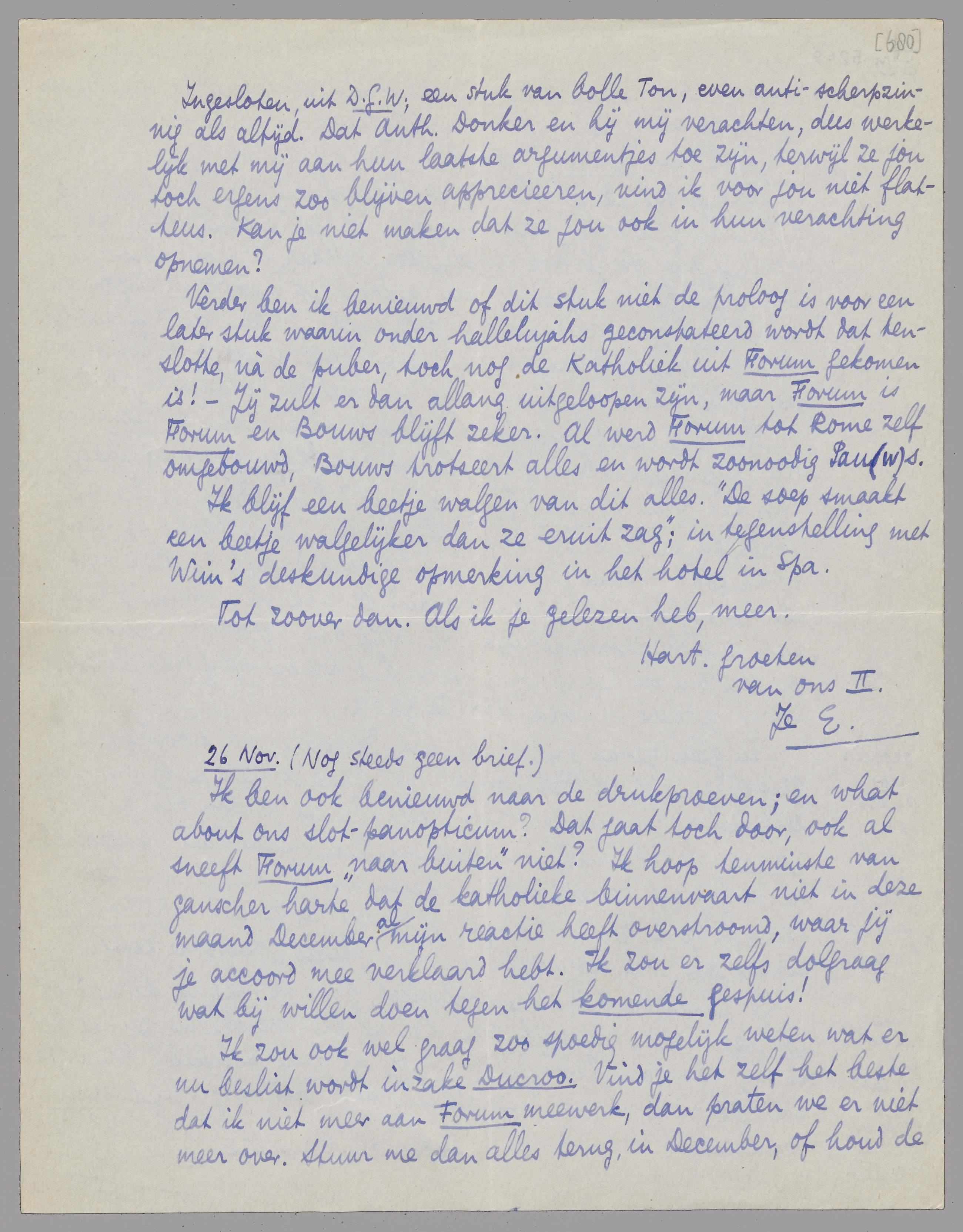 Ik ben ook benieuwd naar de drukproeven; en what about ons slot-panopticum? Dat gaat toch door, ook al sneeft Forum ‘naar buiten’ niet? Ik hoop tenminste van ganscher harte dat de katholieke binnenvaart niet in deze maand December al mijn reactie heeft overstroomd, waar jij je accoord mee verklaard hebt. Ik zou er zelfs dolgraag wat bij willen doen tegen het komende gespuis!