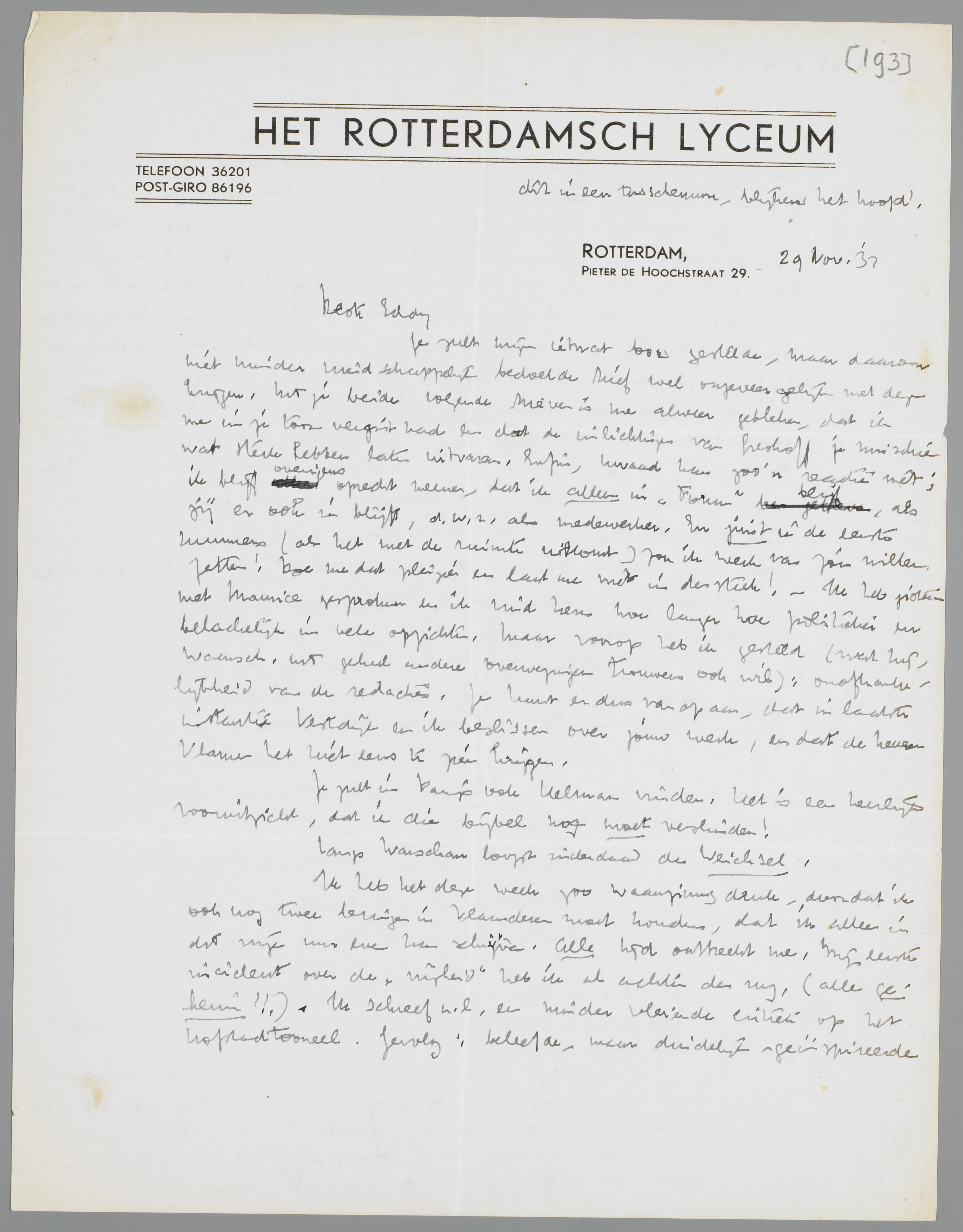 Je zult mijn ietwat boos gestelde, maar daarom niet minder vriendschappelijk bedoelde brief wel ongeveer gelijk met deze krijgen. Uit je beide volgende brieven is me alweer gebleken, dat ik me in je toon vergist had en dat de inlichtingen van Greshoff je misschien wat sterk hebben laten uitvaren. Enfin, kwaad kan zoo'n reactie niet; ik blijf overigens oprecht meenen, dat ik alleen in Forum blijf, als jij er ook in blijft, d.w.z. als medewerker. En juist in de eerste nummers (als het met de ruimte uitkomt) zou ik werk van jou willen zetten! Doe me dat pleizier en laat me niet in den steek! - Ik heb gisteren met Maurice gesproken en ik vind hem hoe langer hoe politieker en belachelijk in vele opzichten. Maar voorop heb ik gesteld (wat hij, waarsch. uit geheel andere overwegingen trouwens ook wil): onafhankelijkheid van de redacties. Je kunt er dus van op aan, dat in laatste instantie Vestdijk en ik beslissen over jouw werk, en dat de heeren Vlamen het niet eens te zien krijgen.