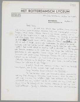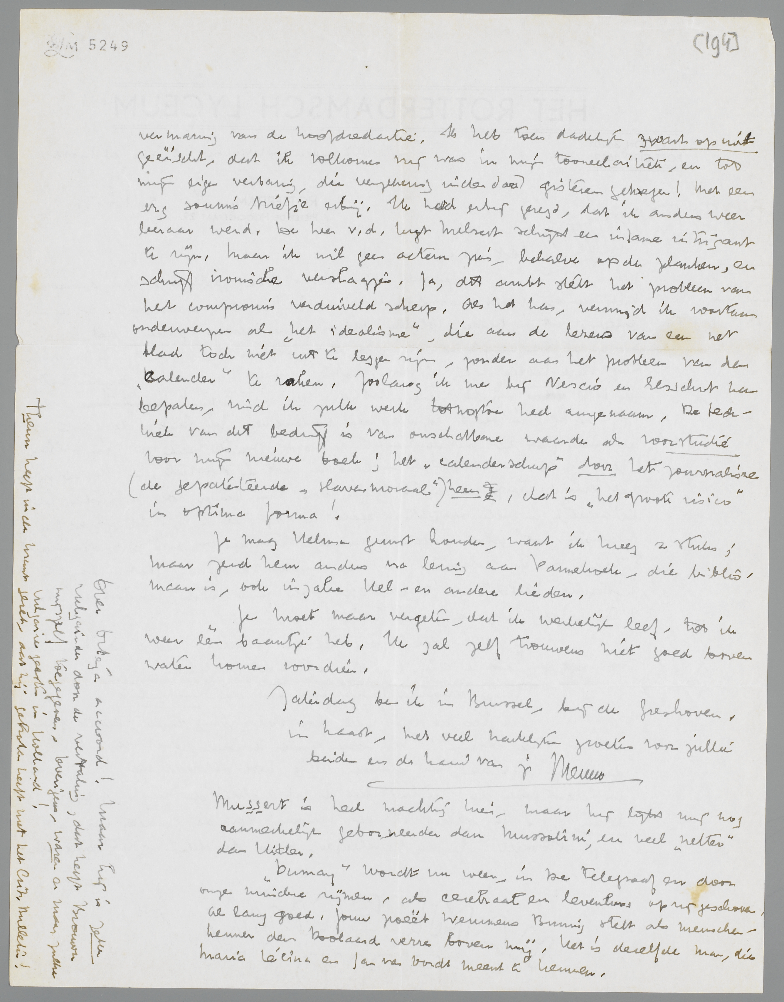 Ik heb het deze week zoo waanzinnig druk, doordat ik ook nog twee lezingen in Vlaanderen moet houden, dat ik alleen in dit vrije uur even kan schrijven. Alle tijd ontbreekt me. Mijn eerste incident over de ‘vrijheid’ heb ik al achter den rug. (alles geheim!!). Ik schreef n.l. een minder vleiende critiek op het Hofstadtooneel. Gevolg: beleefde, maar duidelijk-geïnspireerde vermaning van de hoofdredactie. Ik heb toen dadelijk zwart op wit geëischt, dat ik volkomen vrij was in mijn tooneelcritiek, en tot mijn eigen verbazing, die verzekering inderdaad gisteren gekregen! Met een erg soumis briefje erbij. Ik had erbij gezegd, dat ik anders weer leeraar werd. De heer v.d. Lugt Melsert schijnt een infame intrigant te zijn. Maar ik wil geen acteur zien, behalve op de planken, en schrijf ironische verslagjes. Ja, dit ambt stelt het probleem van het compromis verduiveld scherp. Als het kan, vermijd ik voortaan onderwerpen als ‘het idealisme’, die aan de lezers van een net blad toch niet uit te leggen zijn, zonder aan het probleem van den ‘Calender’ te raken. Zoolang ik me bij Nescio en Elsschot kan bepalen, vind ik zulk werk totnogtoe heel aangenaam. De techniek van dit bedrijf is van onschatbare waarde als voorstudie voor mijn nieuwe boek; het ‘calenderschap’ door het journalisme (de gepatenteerde ‘slavenmoraal’) heen, dat is ‘het groote risico’ in optima forma!