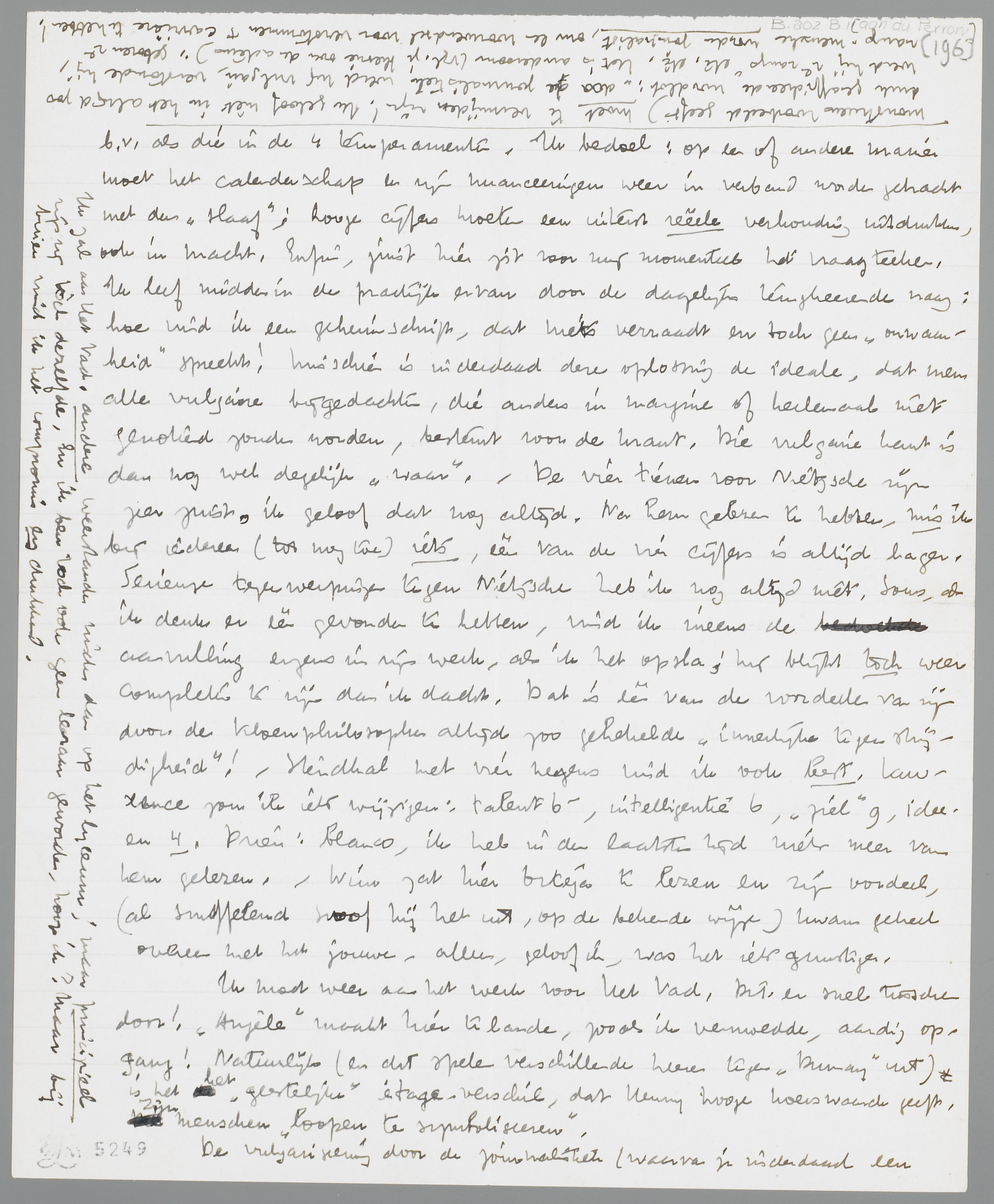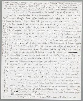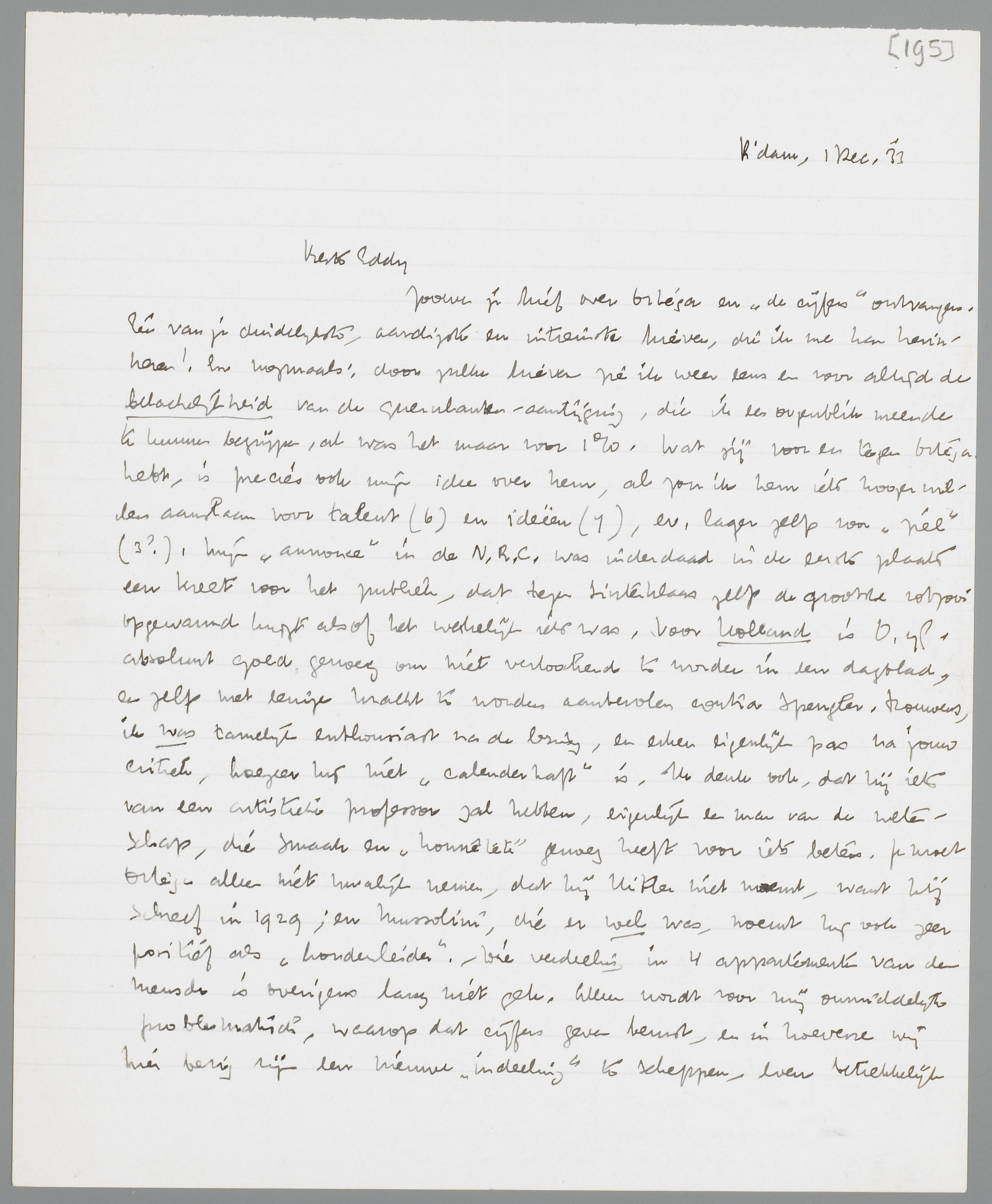 Zooeven je brief over Ortéga en ‘de cijfers’ ontvangen. Eén van je duidelijkste, aardigste en intiemste brieven, die ik me kan herinneren! En nogmaals: door zulke brieven zie ik weer eens en voor altijd de belachelijkheid van de querulanten-aantijging, die ik een oogenblik meende te kunnen begrijpen, al was het maar voor 1%. Wat jij voor en tegen Ortéga hebt, is precies ook mijn idee over hem, al zou ik hem iets hooger willen aanslaan voor talent (6) en ideeën (7), ev. lager zelfs voor ‘ziel’ (3?). Mijn ‘annonce’ in de N.R.C. was inderdaad in de eerste plaats een kreet voor het publiek, dat tegen Sinterklaas zelfs de grootste rotzooi opgewarmd krijgt alsof het werkelijk iets was. Voor Holland is O.y.G. absoluut goed genoeg om niet verloochend te worden in een dagblad, en zelfs met eenige kracht te worden aanbevolen contra Spengler. Trouwens, ik was tamelijk enthousiast na de lezing, en erken eigenlijk pas na jouw critiek, hoezeer hij niet ‘calenderhaft’ is. Ik denk ook, dat hij iets van een artistieke professor zal hebben, eigenlijk een man van de wetenschap, die smaak en ‘honnêteté’ genoeg heeft voor iets beters. Je moet Ortéga alleen niet kwalijk nemen, dat hij Hitler niet noemt, want hij schreef in 1929; en Mussolini, die er wel was, noemt hij ook zeer positief als ‘hordenleider’. - Die verdeeling in 4 appartementen van den mensch is overigens lang niet gek. Alleen wordt voor mij onmiddellijk problematisch, waarop dat cijfers geven berust, en in hoeverre wij hier bezig zijn een nieuwe ‘indeeling’ te scheppen, even betrekkelijk b.v. als die in de 4 temperamenten. Ik bedoel: op een of andere manier moet het calenderschap en zijn nuanceeringen weer in verband worden gebracht met den ‘slaaf’; hooge cijfers moeten een uiterst reëele verhouding uitdrukken, ook in macht. Enfin, juist hier zit voor mij momenteel het vraagteeken. Ik leef midden in de practijk ervan door de dagelijks terugkeerende vraag: hoe vind ik een geheimschrift, dat niets verraadt en toch geen ‘onwaarheid’ spreekt! Misschien is inderdaad deze oplossing de ideale, dat men alle vulgaire bijgedachten, die anders in margine of heelemaal niet genoteerd zouden worden, bestemt voor de krant. Die vulgaire kant is dan nog wel degelijk ‘waar’. - De vier tienen voor Nietzsche zijn zeer juist, ik geloof dat nog altijd. Na hem gelezen te hebben, mis ik bij iedereen (tot nog toe) iets, één van de vier cijfers is altijd lager. Serieuze tegenwerpingen tegen Nietzsche heb ik nog altijd niet. Soms, als ik denk er één gevonden te hebben, vind ik ineens de aanvulling ergens in zijn werk, als ik het opsla; hij blijkt toch weer completer te zijn dan ik dacht. Dat is één van de voordeelen van zijn door de Kloenphilosophen altijd zoo gehekelde ‘innerlijke tegenstrijdigheid’! - Stendhal met vier negens vind ik ook best. Lawrence zou ik iets wijzigen: talent 6-, intelligentie 6, ‘ziel’ 9, ideeën 4. Drieu: blanco, ik heb in den laatsten tijd niets meer van hem gelezen. - Wim zat hier Ortéga te lezen en zijn oordeel, (al snuffelend snoof hij het uit, op de bekende wijze) kwam geheel overeen met het jouwe, alleen, geloof ik, was het iets gunstiger.