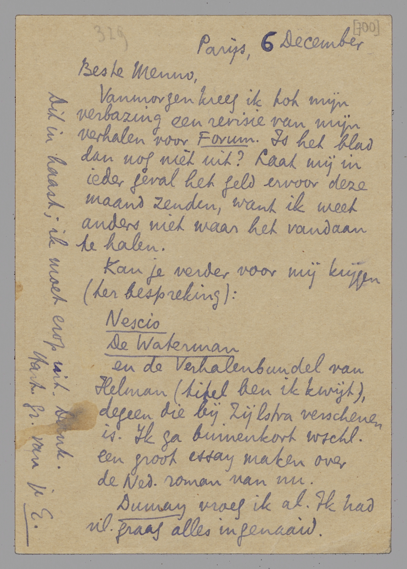 Vanmorgen kreeg ik tot mijn verbazing een revisie van mijn verhalen voor Forum. Is het blad dan nog niet uit? Laat mij in ieder geval het geld ervoor deze maand zenden, want ik weet anders niet waar het vandaan te halen.