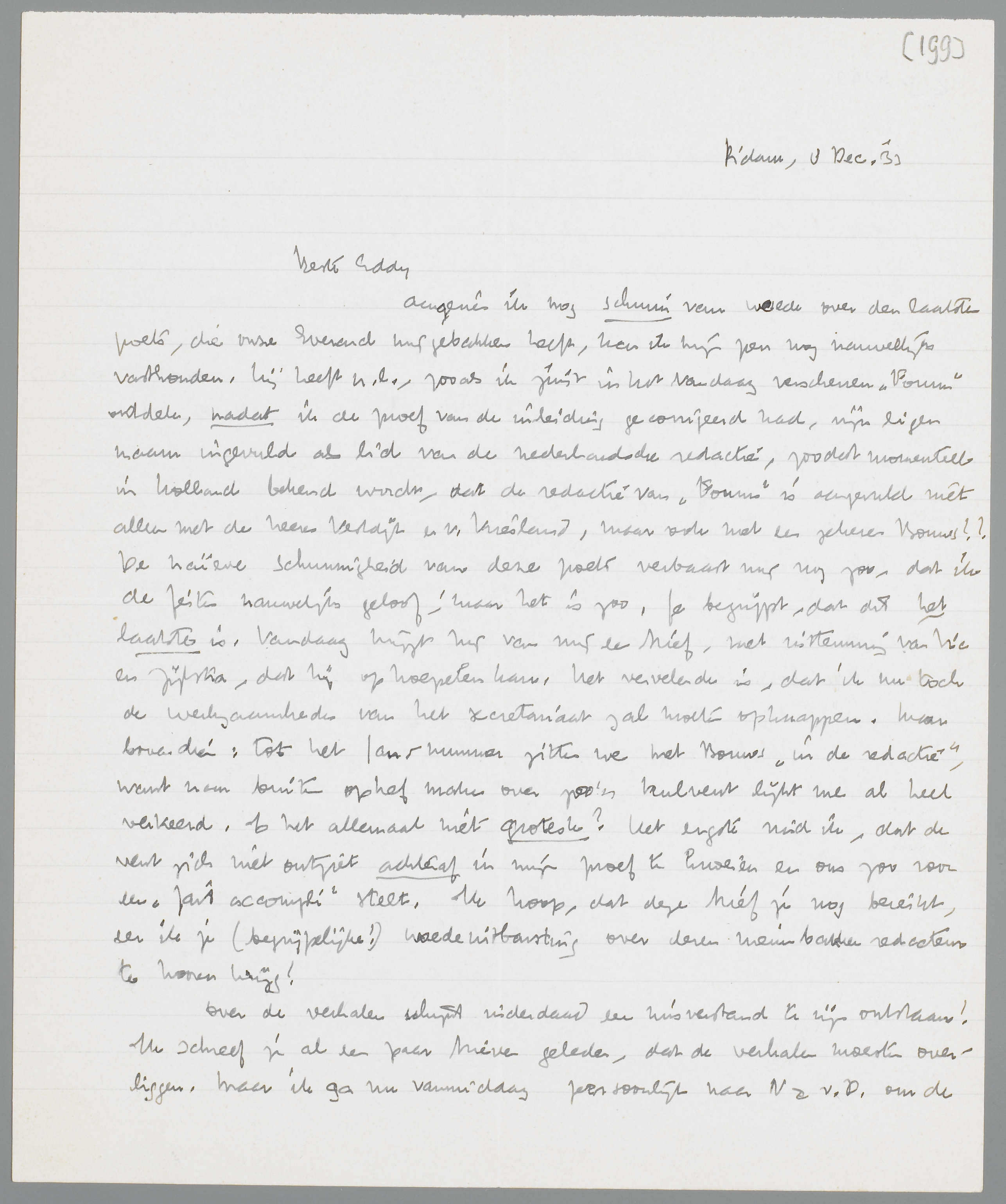 Aangezien ik nog schuim van woede over den laatsten poets, die onze Everard mij gebakken heeft, kan ik mijn pen nog nauwelijks vasthouden. Hij heeft n.l., zooals ik juist in het vandaag verschenen Forum ontdek, nadat ik de proef van de inleiding gecorrigeerd had, zijn eigen naam ingevuld als lid van de nederlandsche redactie, zoodat momenteel in Holland bekend wordt, dat de redactie van Forum is aangevuld niet alleen met de heeren Vestdijk en v. Vriesland, maar ook met een zekeren Bouws!! De naïeve schunnigheid van deze poets verbaast mij nog zoo, dat ik de feiten nauwelijks geloof; maar het is zoo. Je begrijpt, dat dit het laatste is. Vandaag krijgt hij van mij een brief, met instemming van Vic en Zijlstra, dat hij ophoepelen kan. Het vervelende is, dat ik nu toch de werkzaamheden van het secretariaat zal moeten opknappen. Maar bovendien: tot het Jan.-nummer zitten we met Bouws ‘in de redactie’, want naar buiten ophef maken over zoo'n kulvent lijkt me al heel verkeerd. Is het allemaal niet grotesk? Het ergste vind ik, dat de vent zich niet ontziet achteraf in mijn proef te knoeien en ons zoo voor een ‘fait accompli’ stelt. Ik hoop, dat deze brief je nog bereikt, eer ik je (begrijpelijke!) woedeuitbarsting over dezen nieuwbakken redacteur te hooren krijg!