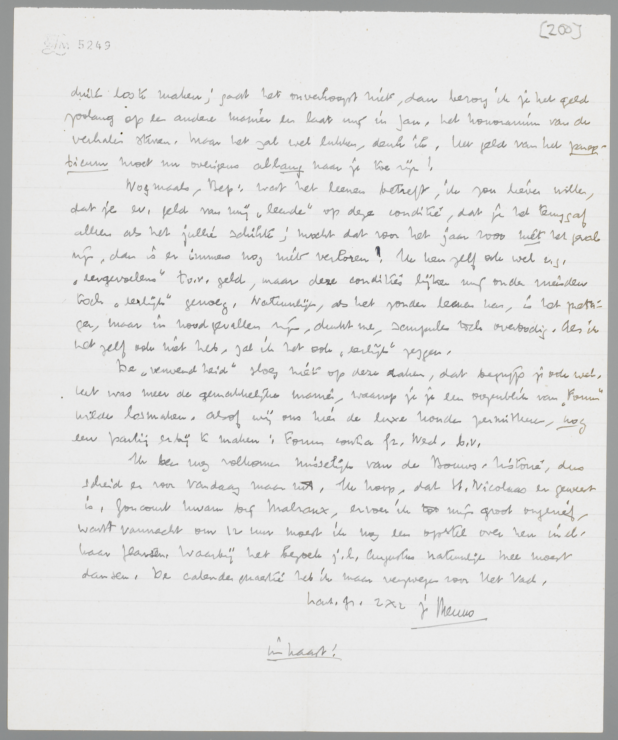 Over de verhalen schijnt inderdaad een misverstand te zijn ontstaan! Ik schreef je al een paar brieven geleden, dat de verhalen moesten overliggen. Maar ik ga nu vanmiddag persoonlijk naar N. & v.D. om de duiten los te maken; gaat het onverhoopt niet, dan bezorg ik je het geld zoolang op een andere manier en laat mij in Jan. het honorarium van de verhalen sturen. Maar het zal wel lukken, denk ik. Het geld van het panopticum moet nu overigens allang naar je toe zijn!