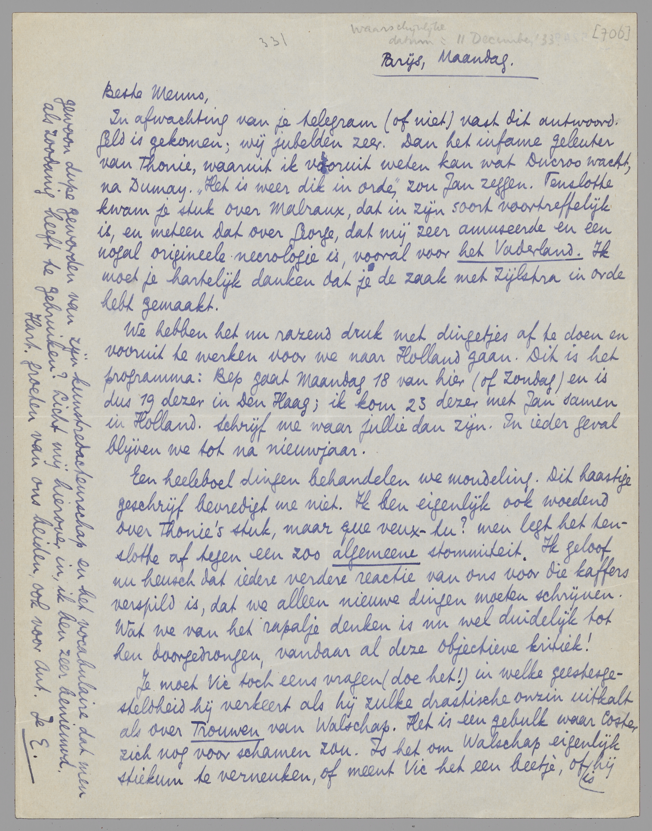 In afwachting van je telegram (of niet) vast dit antwoord. Geld is gekomen; wij jubelden zeer. Dan het infame geleuter van Thonie, waaruit ik vooruit weten kan wat Ducroo wacht, na Dumay. ‘Het is weer dik in orde’, zou Jan zeggen. Tenslotte kwam je stuk over Malraux, dat in zijn soort voortreffelijk is, en meteen dat over George, dat mij zeer amuseerde en een nogal origineele necrologie is, vooral voor het Vaderland. Ik moet je hartelijk danken dat je de zaak met Zijlstra in orde hebt gemaakt.