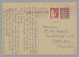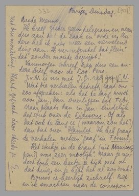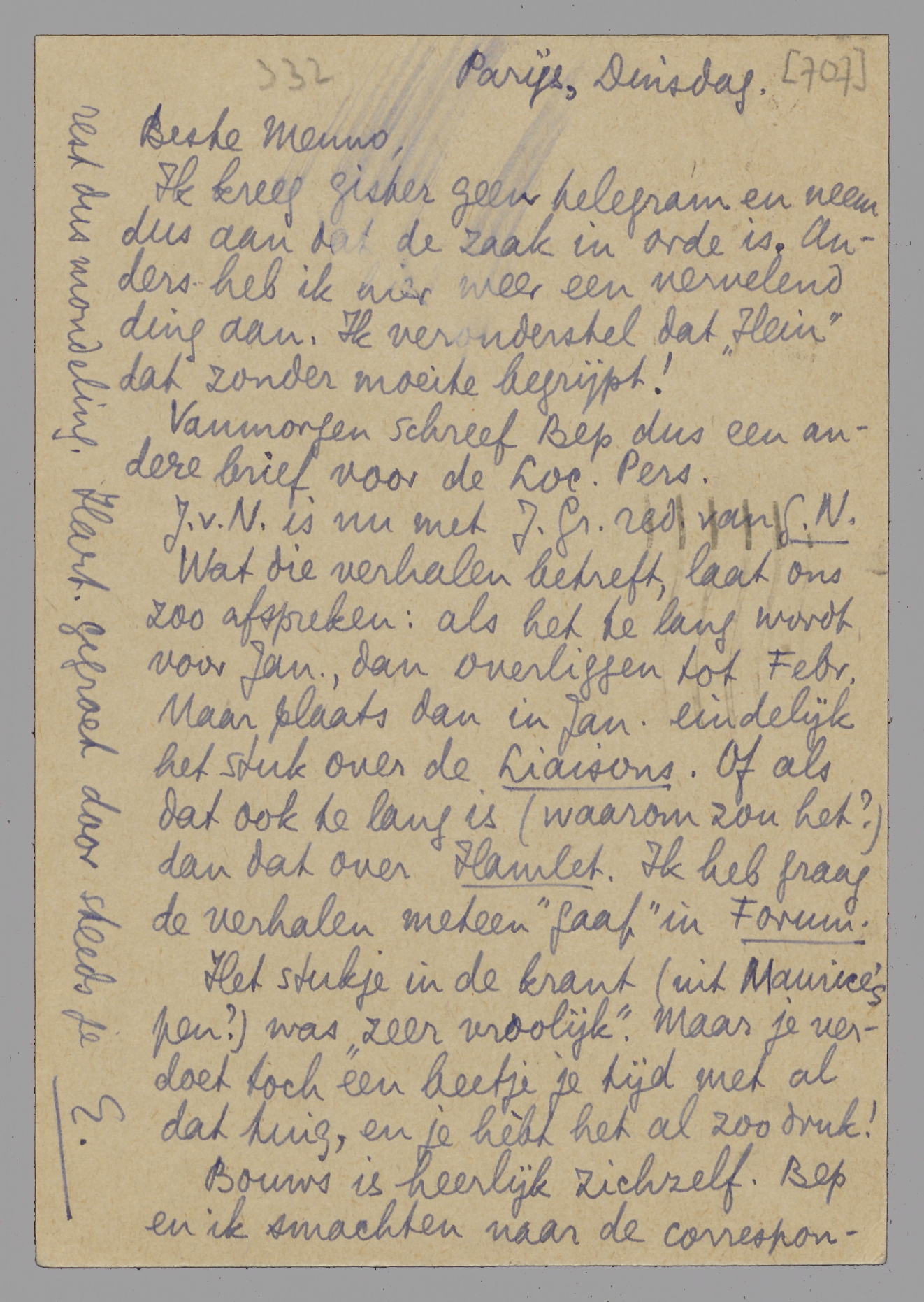 Ik kreeg gister geen telegram en neem dus aan dat de zaak in orde is. Anders heb ik hier weer een vervelend ding aan. Ik veronderstel dat ‘Hein’ dat zonder moeite begrijpt. Vanmorgen schreef Bep dus een andere brief voor de Loc. Pers! J.v.N. is nu met J. Gr. red. van G.N.