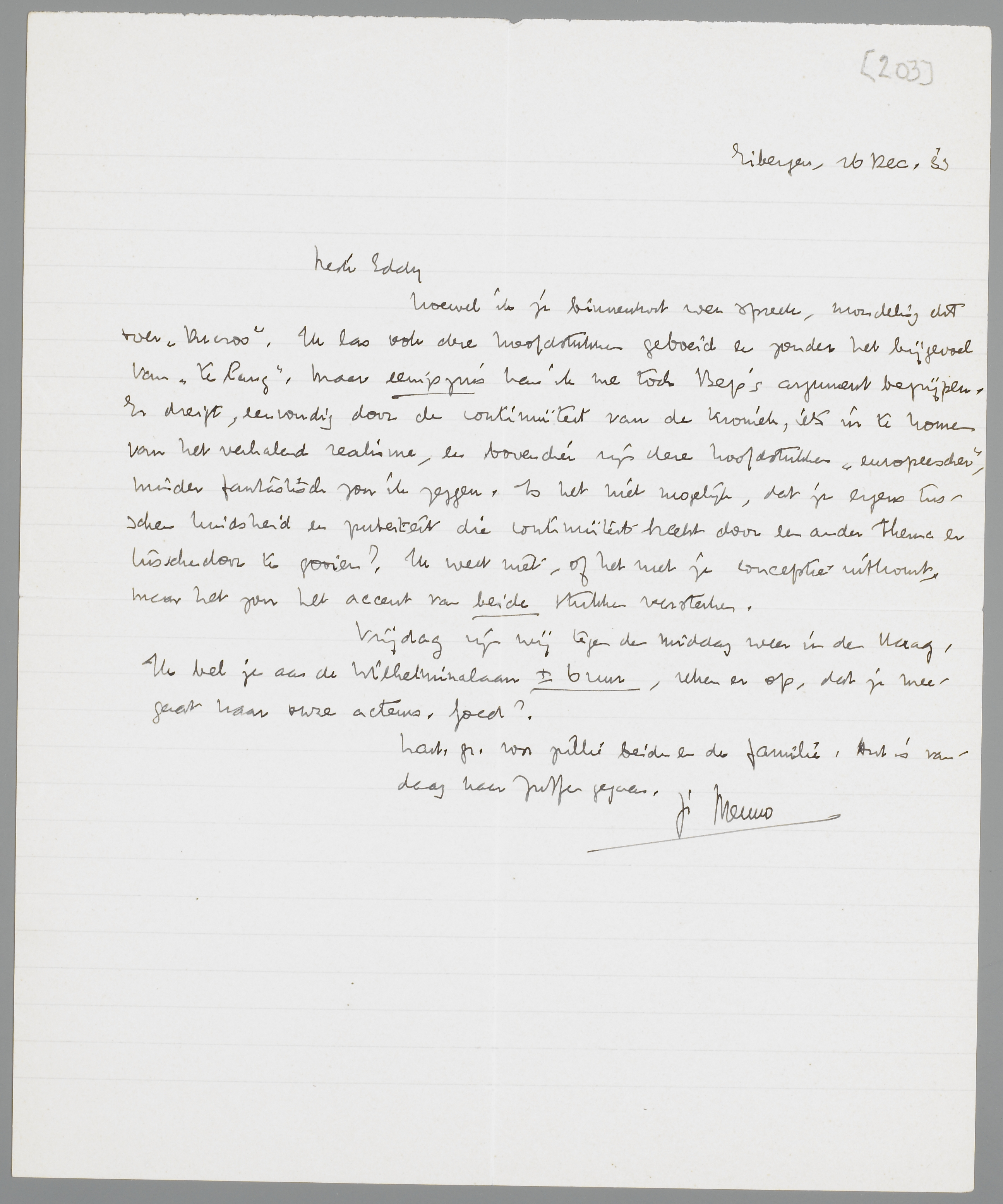 Vrijdag zijn wij tegen den middag weer in den Haag. Ik bel je aan de Wilhelminalaan ± 6 uur, reken er op, dat je meegaat naar onze acteurs. Goed?
