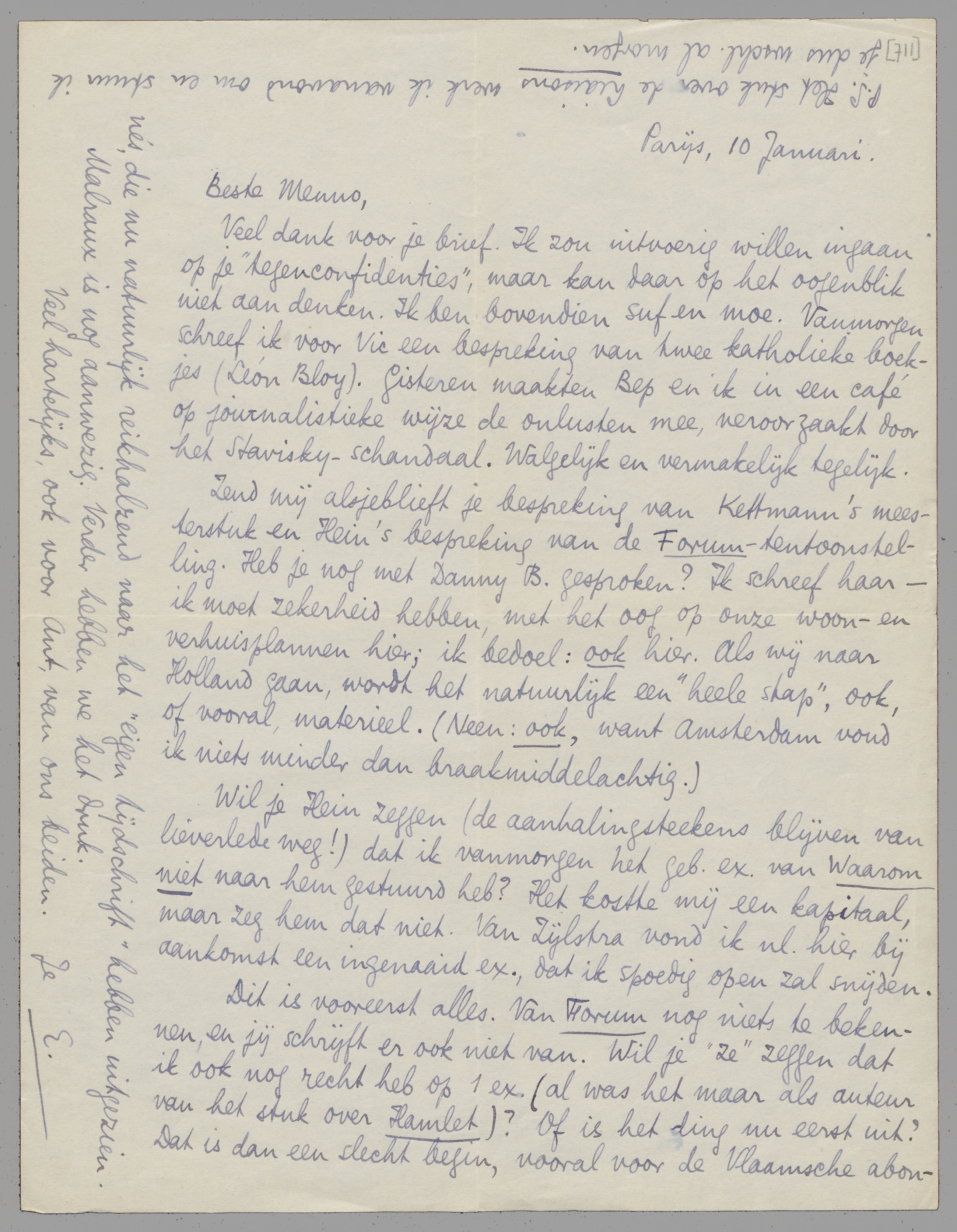 Veel dank voor je brief. Ik zou uitvoerig willen ingaan op je ‘tegenconfidenties’, maar kan daar op het oogenblik niet aan denken. Ik ben bovendien suf en moe. Vanmorgen schreef ik voor Vic een bespreking van twee katholieke boekjes (Léon Bloy). Gisteren maakten Bep en ik in een café op journalistieke wijze de onlusten mee, veroorzaakt door het Stavisky-schandaal. Walgelijk en vermakelijk tegelijk.