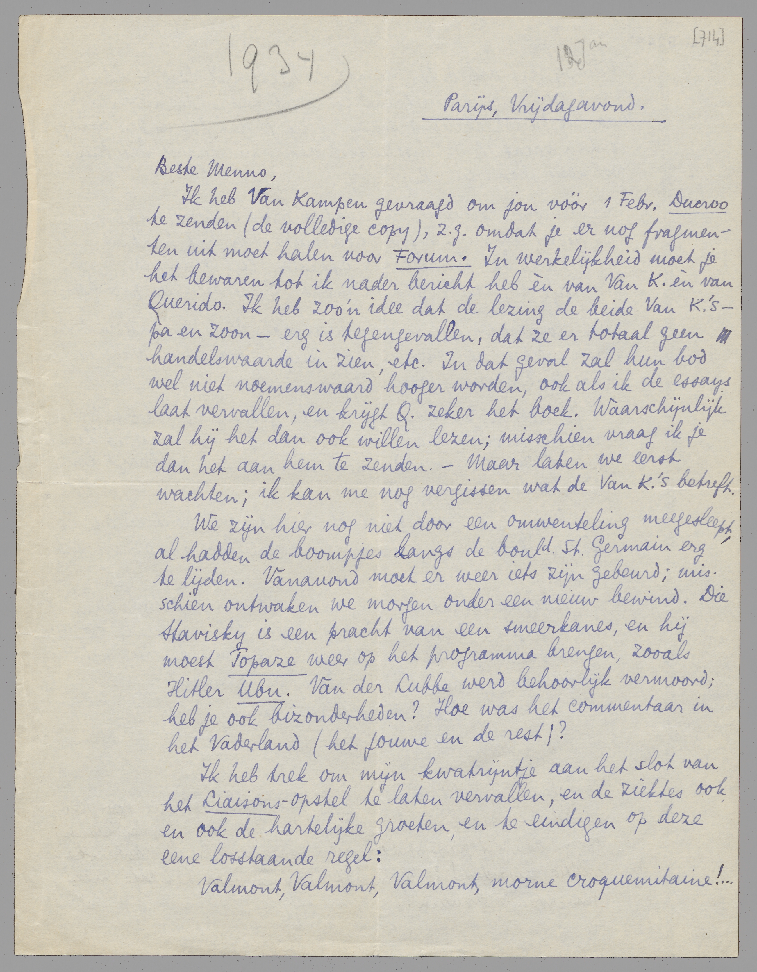 We zijn hier nog niet door een omwenteling meegesleept, al hadden de boompjes langs de bould. St. Germain erg te lijden. Vanavond moet er weer iets zijn gebeurd; misschien ontwaken we morgen onder een nieuw bewind. Die Stavisky is een pracht van een smeerkanes, en hij moest Topaze weer op het programma brengen, zooals Hitler Ubu. Van der Lubbe werd behoorlijk vermoord; heb je ook bizonderheden? Hoe was het commentaar in het Vaderland (het jouwe en de rest)?
