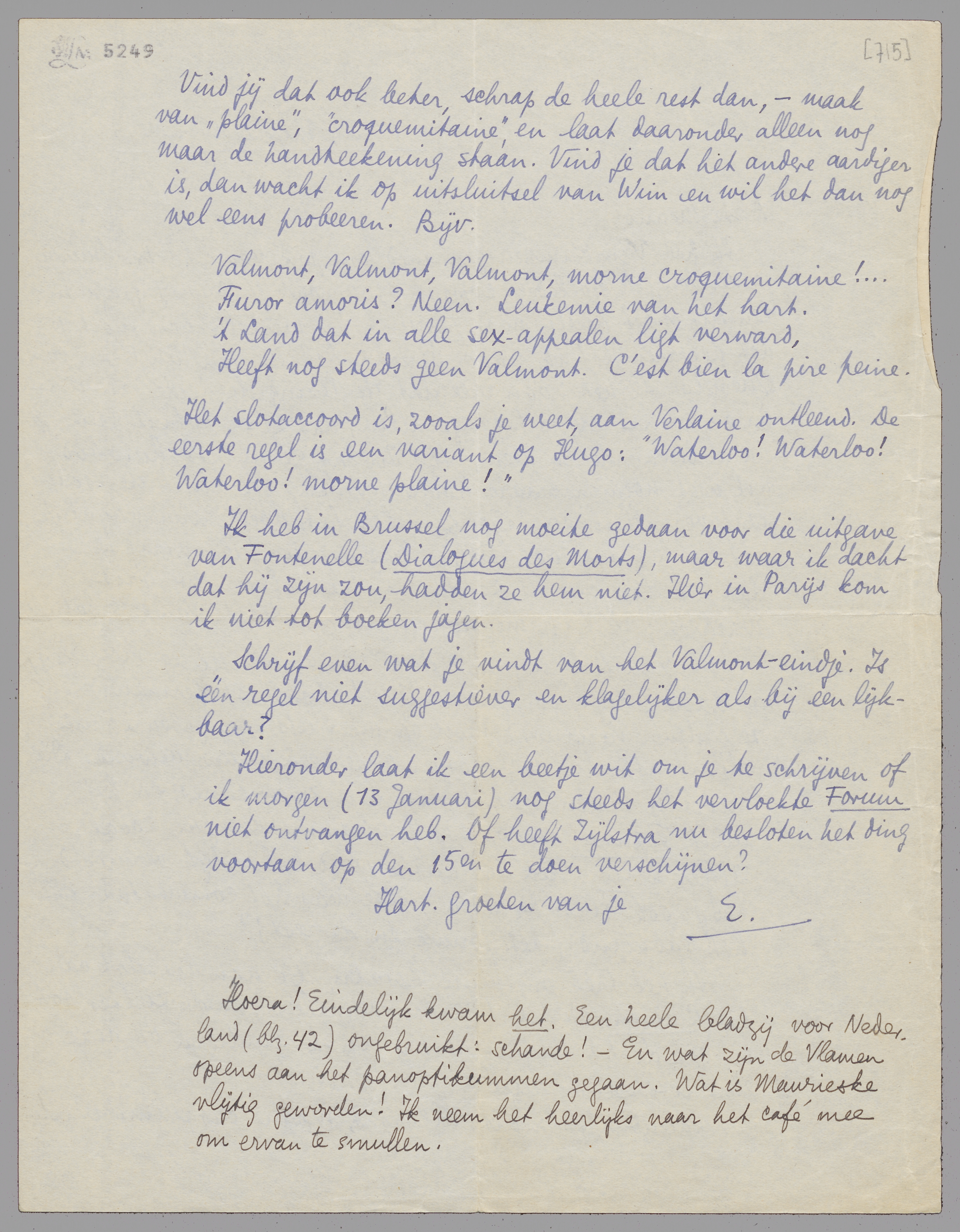 Ik heb Van Kampen gevraagd om jou vóór 1 Febr. Ducroo te zenden (de volledige copy), z.g. omdat je er nog fragmenten uit moet halen voor Forum. In werkelijkheid moet je het bewaren tot ik nader bericht heb èn van Van K. èn van Querido. Ik heb zoo'n idee dat de lezing de beide Van K.s - pa en zoon - erg is tegengevallen, dat ze er totaal geen handelswaarde in zien, etc. In dat geval zal hun bod wel niet noemenswaard hooger worden, ook als ik de essays laat vervallen, en krijgt Q. zeker het boek. Waarschijnlijk zal hij het dan ook willen lezen; misschien vraag ik je dan het aan hem te zenden. - Maar laten we eerst wachten; ik kan me nog vergissen wat de Van K.s betreft.