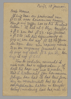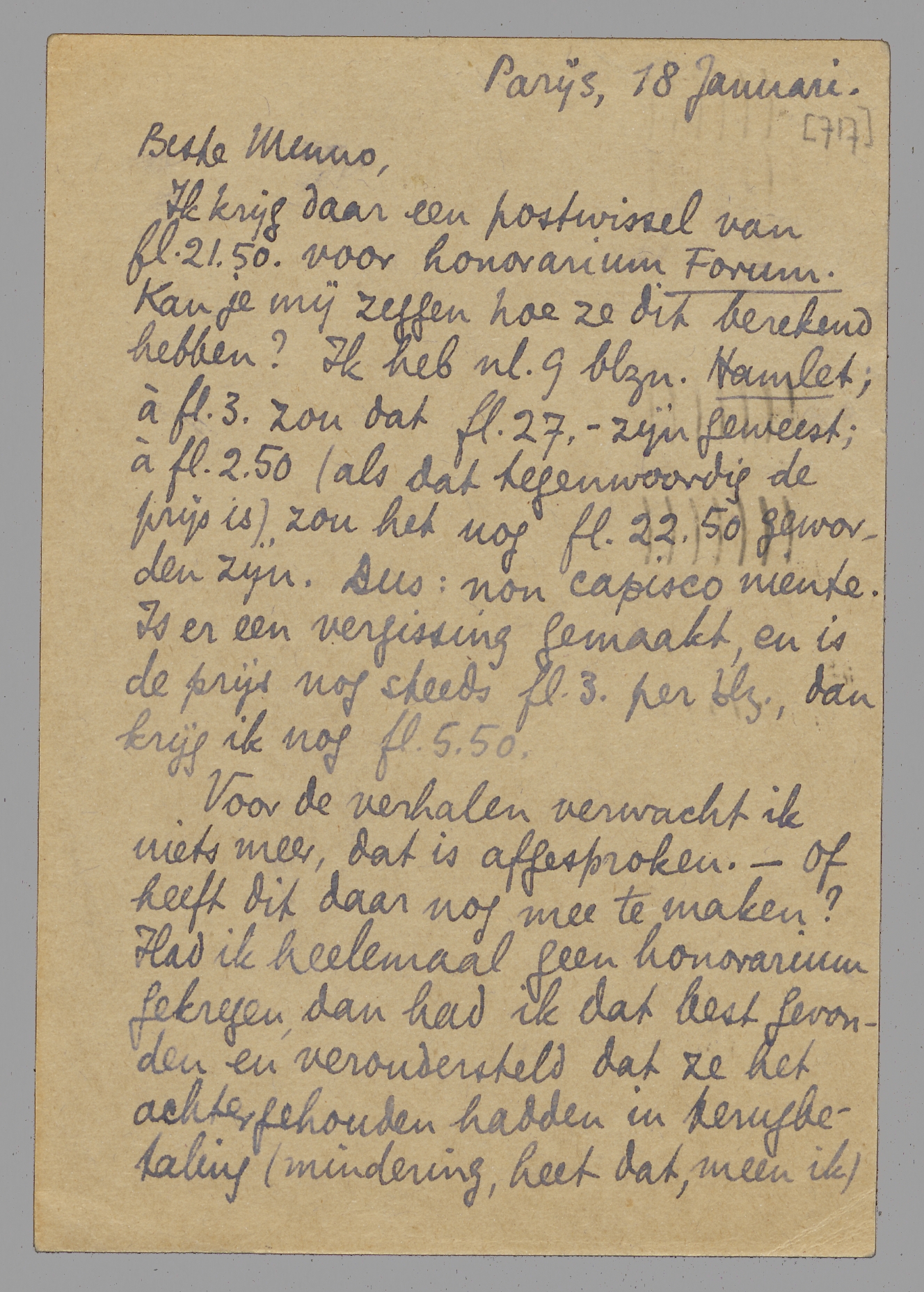 Ik krijg daar een postwissel van fl. 21.50. voor honorarium Forum. Kan je mij zeggen hoe ze dit berekend hebben? Ik heb nl. 9 blzn. Hamlet; à fl. 3. zou dat fl. 27. - zijn geweest; à fl. 2.50 (als dat tegenwoordig de prijs is) zou het nog fl. 22.50 geworden zijn. Dus: non capisco niente. Is er een vergissing gemaakt, en is de prijs nog steeds fl. 3. per blz., dan krijg ik nog fl. 5.50.