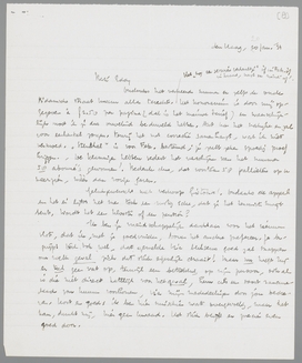 Bep's suppositie over de evenredigheid Politicus: Carn. d. Minn. = de Lang: Gerda, is waarschijnlijk heel juist! Ik bestudeer dezen ‘leider’ van een ‘bloeiend dagblad’ met groote intensiteit, voor mijn heeren- en slavenmoraal. Het is soms enerverend, dit vak, maar ik betreur het toch niet, de leerarij te hebben verlaten. Dit milieu heeft duizend nieuwe aspecten, ik krijg alle ‘grootheden’ in de buurt en dat materiaal is prachtig. Tenslotte was Dumay uitgepraat, wat zijn omgeving betreft. En dan: ik heb de muurvaste overtuiging (zooals ik je al eens schreef), dat het praatje van de aan-de-journalistiek-verdorvenen een excuus is van vage talenten, en dat juist zulk een baantje in de volkomen idiote wereld van den ‘geest’ moet bewijzen, of ik nog het recht heb een boek te schrijven, dat daar boven uitgaat. Zoo neen, dan zal ik er ook den tijd niet voor vinden, anders perse wel. Al moest het tijdens het koffiedrinken en eten. - ‘Cor’ heb ik nog niet gezien, gelukkig. Jessner suffit.