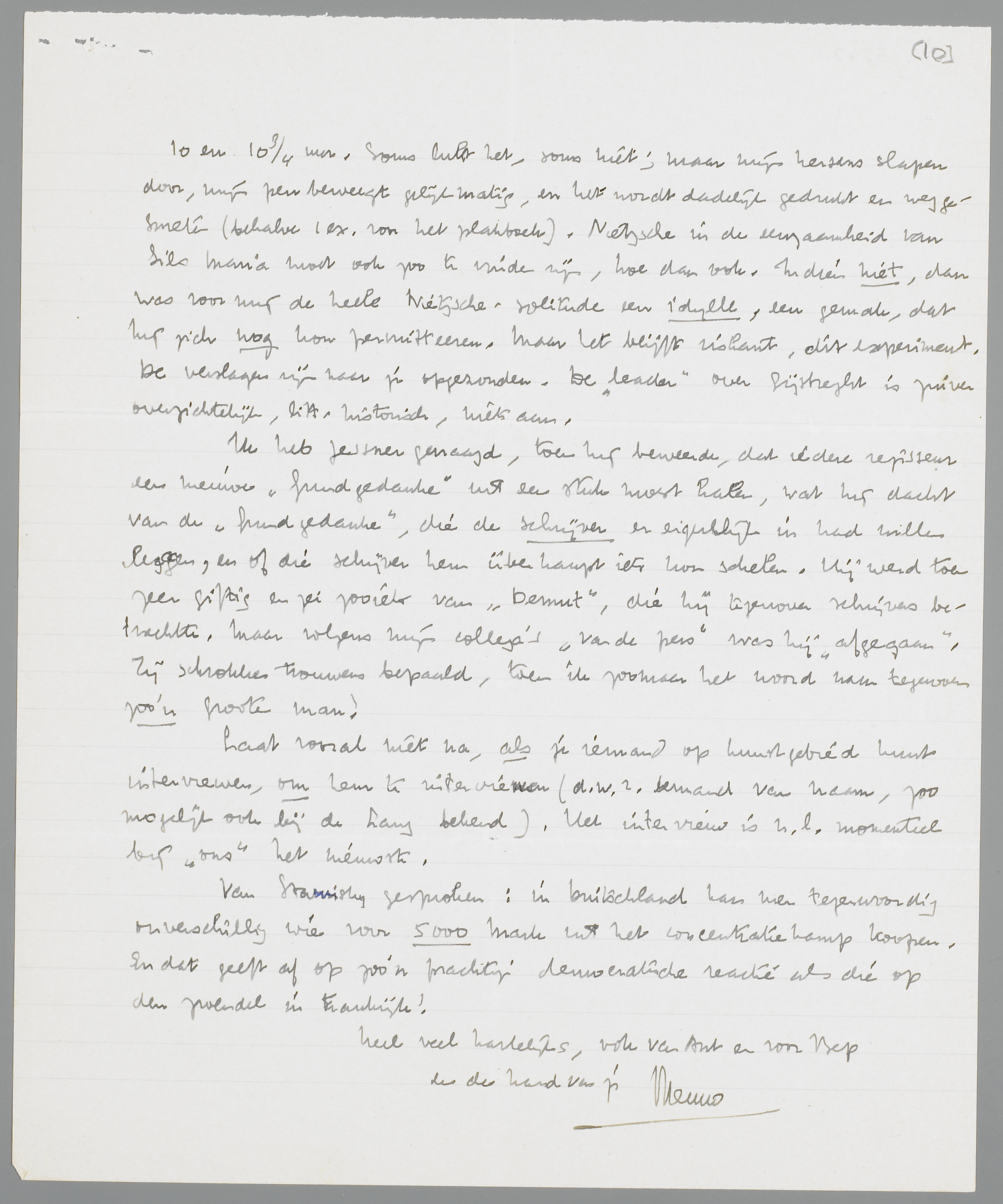 Nog even over de ‘zaken’. Ik plaatste jullie stuk over Jooss met de vereischte ‘koppigheid’ (nog één te kort) en daarnaast een schattig stukje van mij over Goldoni. Zooiets schrijf ik nu 's morgens tusschen 10 en 10¾ uur. Soms lukt het, soms niet; maar mijn hersens slapen door, mijn pen beweegt gelijkmatig, en het wordt dadelijk gedrukt en weggesmeten (behalve 1 ex. voor het plakboek). Nietzsche in de eenzaamheid van Sils Maria moet ook zoo te vinden zijn, hoe dan ook. Indien niet, dan was voor mij de heele Nietzsche-solitude een idylle, een gemak, dat hij zich nog kon permitteeren. Maar het blijft riskant, dit experiment. De verslagen zijn naar je opgezonden. De ‘leader’ over Gijsbreght is zuiver overzichtelijk, litt. historisch, niets aan.