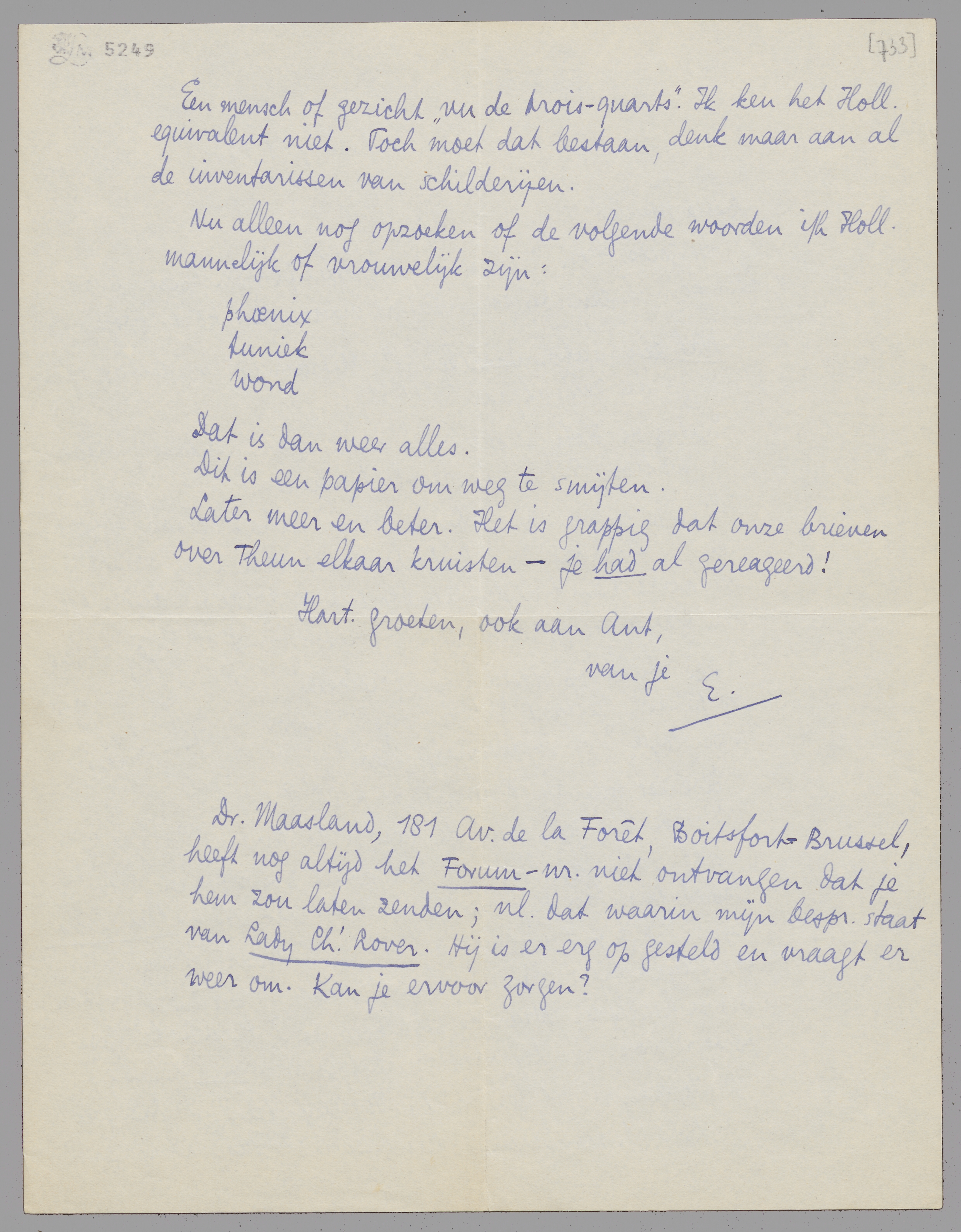 Dr. Maasland, 181 Av. de la Forêt, Boitsfort-Brussel, heeft nog altijd het Forum-nr. niet ontvangen dat je hem zou laten zenden; nl. dat waarin mijn bespr. staat van Lady Ch' Lover. Hij is er erg op gesteld en vraagt er weer om. Kan je ervoor zorgen?