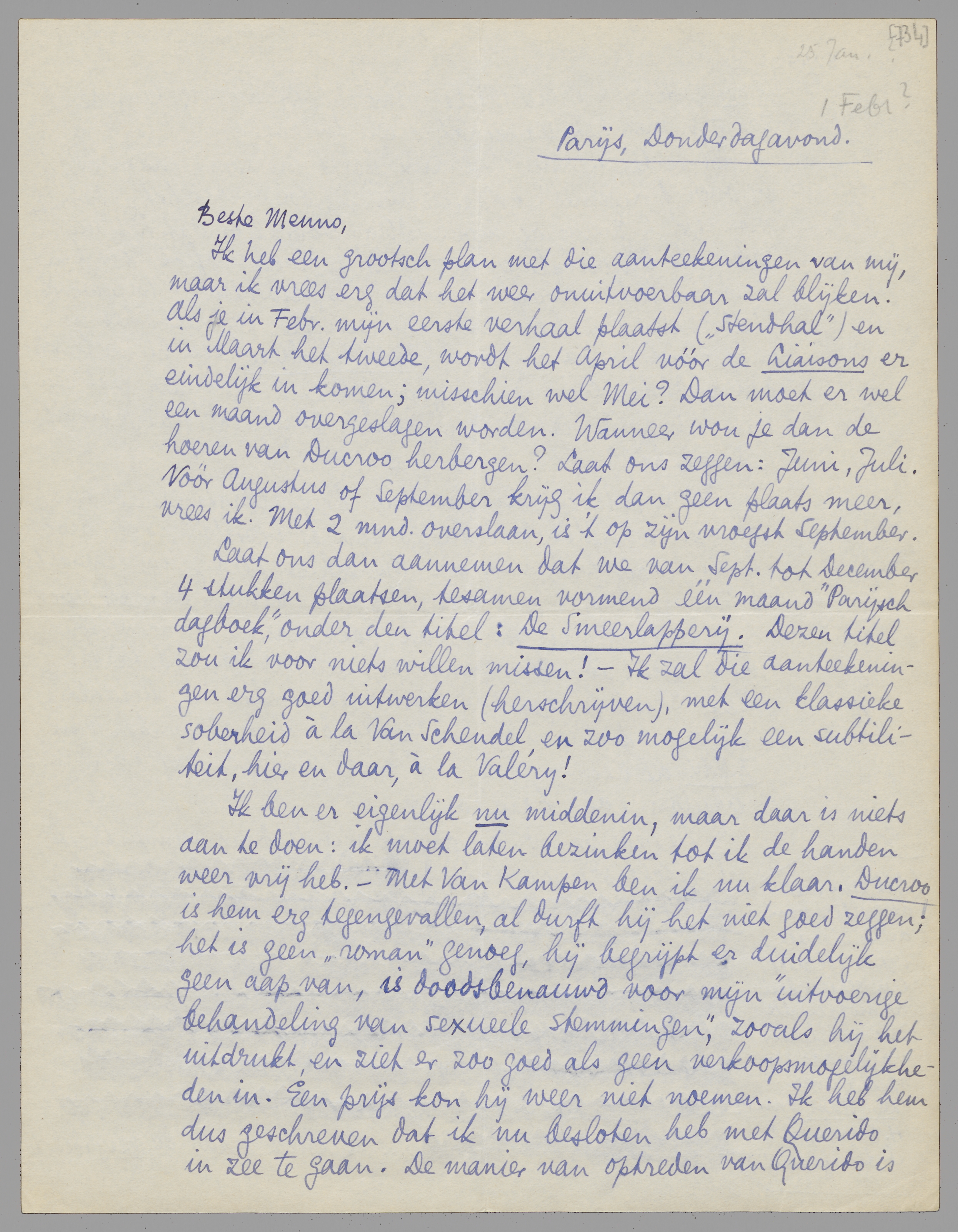 Ik heb een grootsch plan met die aanteekeningen van mij, maar ik vrees erg dat het weer onuitvoerbaar zal blijken. Als je in Febr. mijn eerste verhaal plaatst (Stendhal) en in Maart het tweede, wordt het April vóór de Liaisons er eindelijk in komen; misschien wel Mei? Dan moet er wel een maand overgeslagen worden. Wanneer wou je dan de hoeren van Ducroo herbergen? Laat ons zeggen: Juni, Juli. Vóór Augustus of September krijg ik dan geen plaats meer, vrees ik. Met 2 mnd. overslaan, is 't op zijn vroegst September.