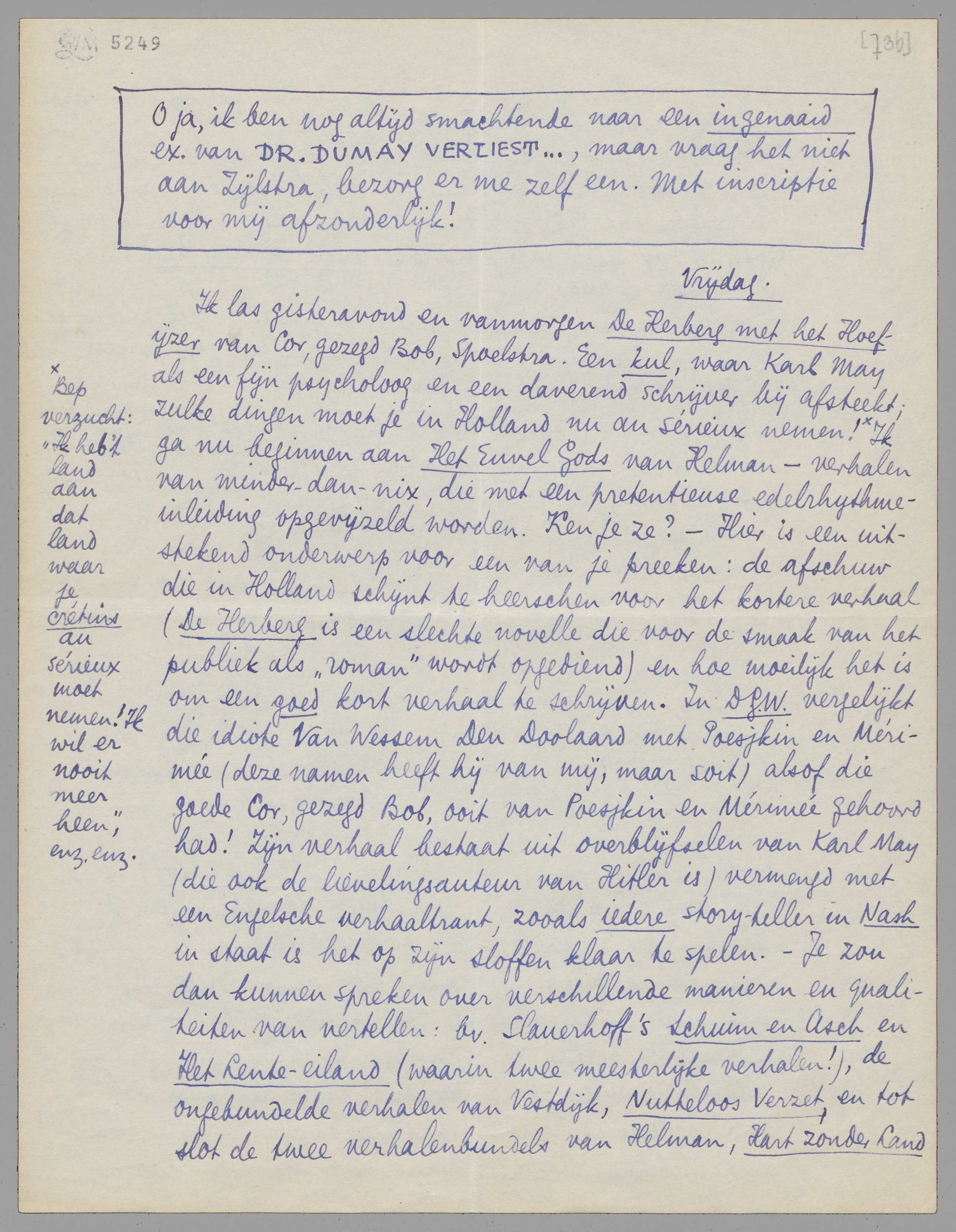 Ik las gisteravond en vanmorgen De Herberg met het Hoefijzer van Cor, gezegd Bob, Spoelstra. Een kul, waar Karl May als een fijn psycholoog en een daverend schrijver bij afsteekt; zulke dingen moet je in Holland nu au sérieux nemen! (Bep verzucht: 'Ik heb 't land aan dat land waar je crétins au sérieux moet nemen. Ik wil er nooit meer heen', enz. enz.) Ik ga nu beginnen aan Het Euvel Gods van Helman - verhalen van minder-dan-nix, die met een pretentieuse edelrhythme-inleiding opgevijzeld worden. Ken je ze? - Hier is een uitstekend onderwerp voor een van je preeken: de afschuw die in Holland schijnt te heerschen voor het kortere verhaal (De Herberg is een slechte novelle die voor de smaak van het publiek als ‘roman’ wordt opgediend) en hoe moeilijk het is om een goed kort verhaal te schrijven. In D.G.W. vergelijkt die idiote Van Wessem Den Doolaard met Poesjkin en Mérimée (deze namen heeft hij van mij, maar soit) alsof die goede Cor, gezegd Bob, ooit van Poesjkin en Mérimée gehoord had! Zijn verhaal bestaat uit overblijfselen van Karl May (die ook de lievelingsauteur van Hitler is) vermengd met een Engelsche verhaaltrant, zooals iedere story-teller in Nash in staat is het op zijn sloffen klaar te spelen. - Je zou dan kunnen spreken over verschillende manieren en qualiteiten van vertellen: bv. Slauerhoff's Schuim en Asch en Het Lente-eiland (waarin twee meesterlijke verhalen!), de ongebundelde verhalen van Vestdijk, Nutteloos Verzet, en tot slot de twee verhalenbundels van Helman, Hart zonder Land en Het Euvel Gods. Je kunt De Bries van Kuyle er nog bij nemen en het door jou bewonderde verhaal Sjooks: dit nu is de triomf van de verteller die niets te zeggen heeft, maar door het goed schrijven en de kortheid wordt gered - d.w.z. prachtig den schijn ophoudt (getuige het 2e verhaal van De Bries, over de Russische revolutie!). Toen hij in Harten en Brood zijn ‘stijl’ moest vullen met iets anders kwam hij verdomd poover voor den dag! Moet je dat boek ook niet bespreken? Je kunt ook Marianne erbij halen: de vertelkunst van Jef Last, soms gelijkend op die van Kuyle, wat het gesorteerde effect en de middelen betreft, - Lachgas bv. is ondanks alle leegheid heel goed geslaagd. Als je dit alles aan het vaderlandsche publiek uitlegt, heb je een nuttige, boeiende en zelfs geleerde preek gehouden; verzuim het dus niet! - (Maar zeg er dan niet bij dat Poe niet tippen kan bij Vestdijk, want al deze heeren bij elkaar kunnen niet tippen aan Poe.)