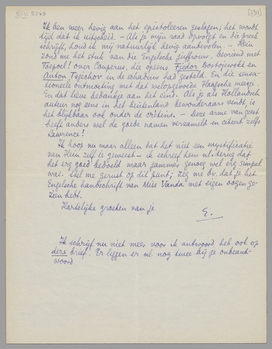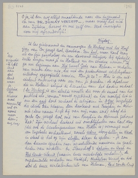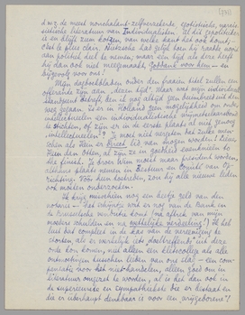 Ik voel mij heelemaal inkrimpen bij het idee dat ik over het nieuwe Hollandsche proza zou gaan schrijven, zooals ik mij had voorgenomen. Wat hebben wij met die flikkers te maken? Het artikel van Theun de Vries heeft het onderscheid voldoende aangetoond, ik hoop dat je met verachting erop hebt geantwoord. Ik ben weer hevig aan het epistoleeren geslagen; het wordt tijd dat ik uitscheid. - Als je mijn raad opvolgt en die preek schrijft, houd ik mij natuurlijk hevig aanbevolen. - Hein zond me het stuk van die Engelsche juffrouw, bevriend met Toepoel! over Couperus, die opeens Fjedor Dostojewski en Anton Tsjechov in de schaduw had gesteld. En die sensationeele ontmoeting met dat welopgevoede Haagsche meisje. En dat lieve bedankje aan het eind. Als je als Hollandsch auteur nog eens in het buitenland bewonderaars vindt, is het blijkbaar ook onder de crétins. - Deze arme van geest heeft anders wel de goede namen verzameld en citeert zelfs Lawrence!