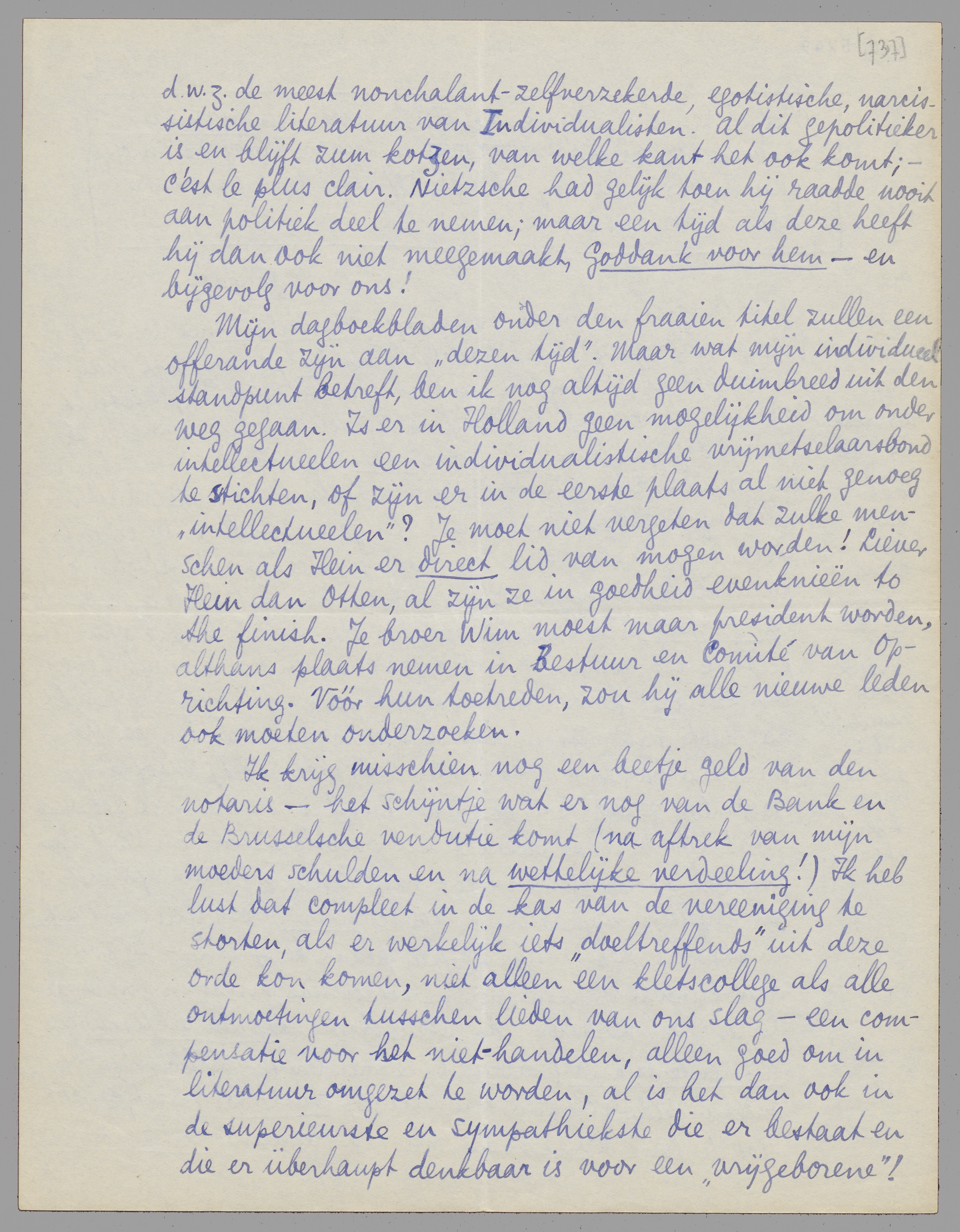 Ik krijg misschien nog een beetje geld van den notaris - het schijntje wat er nog van de Bank en de Brusselsche vendutie komt (na aftrek van mijn moeders schulden en na wettelijke verdeeling!) Ik heb lust dat compleet in de kas van de vereeniging te storten, als er werkelijk iets ‘doeltreffends’ uit deze orde kon komen, niet alleen een kletscollege als alle ontmoetingen tusschen lieden van ons slag - een compensatie voor het niet-handelen, alleen goed om in literatuur omgezet te worden, al is het dan ook in de superieurste en sympathiekste die er bestaat en die er überhaupt denkbaar is voor een ‘vrijgeborene’!