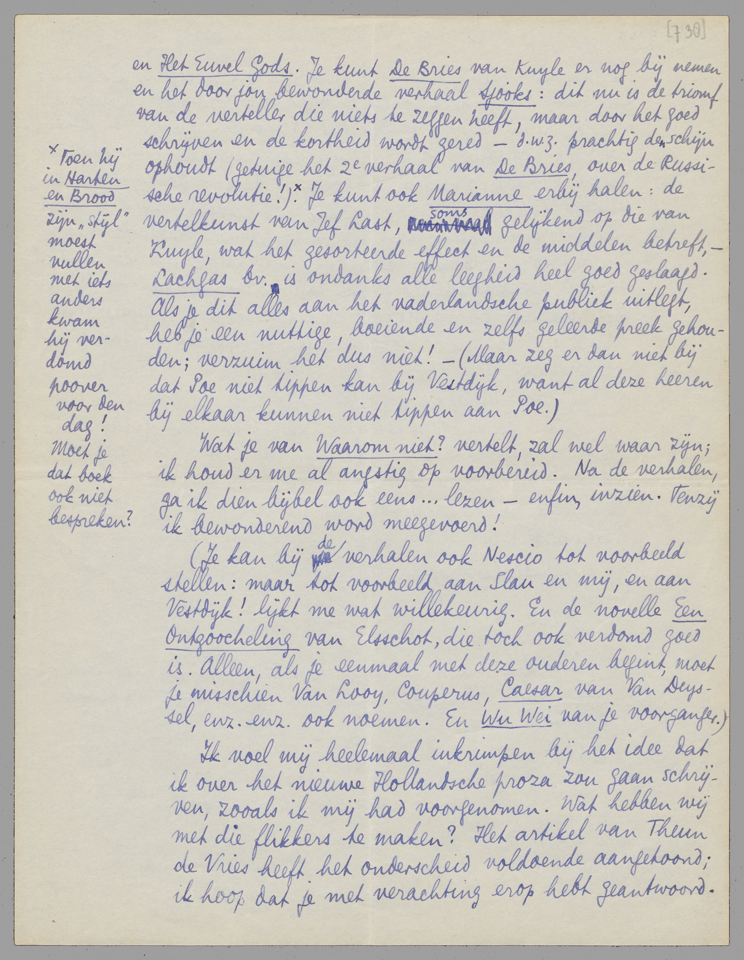 (Je kan bij de verhalen ook Nescio tot voorbeeld stellen: maar tot voorbeeld aan Slau en mij, en aan Vestdijk! lijkt me wat willekeurig. En de novelle Een Ontgoocheling van Elsschot, die toch ook verdomd goed is. Alleen, als je eenmaal met deze ouderen begint, moet je misschien Van Looy, Couperus, Caesar van Van Deyssel, enz. enz. ook noemen. En Wu Wei van je voorganger.)